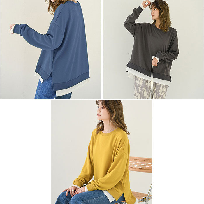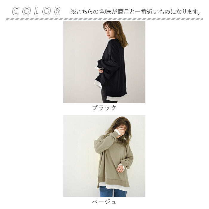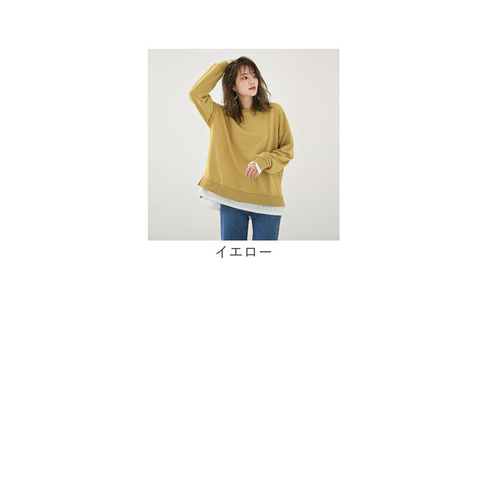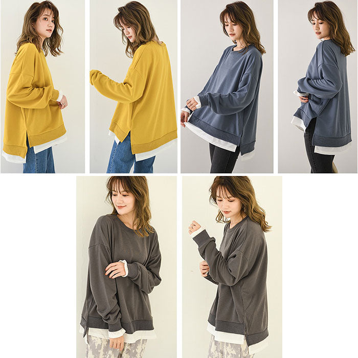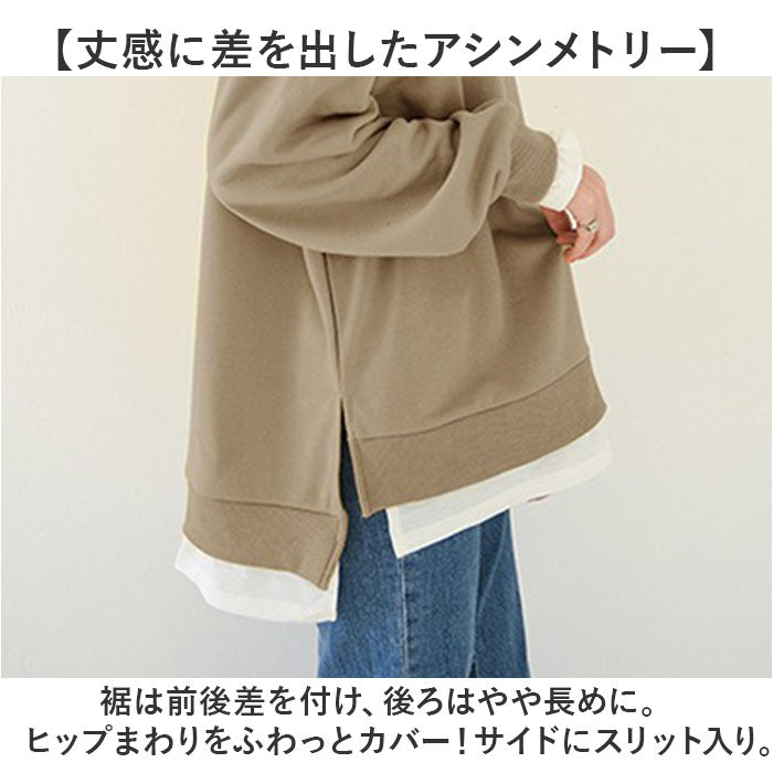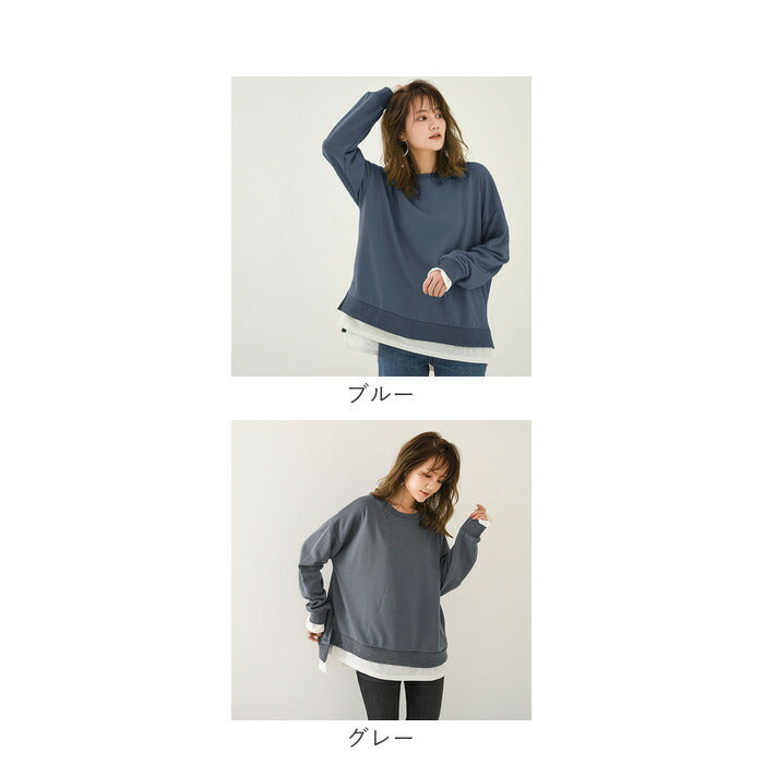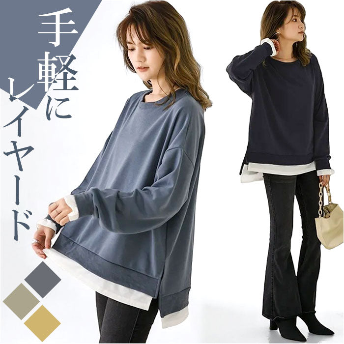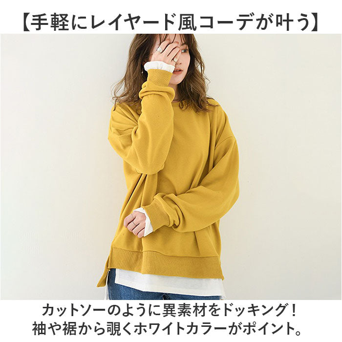 トレーナー 長袖 レディース 通販 無地 カットソー スウェット レイヤード風 ゆったり 体型カバー オーバーサイズ ビッグシルエット おしゃれ かわいい シンプル カジュアル トップス