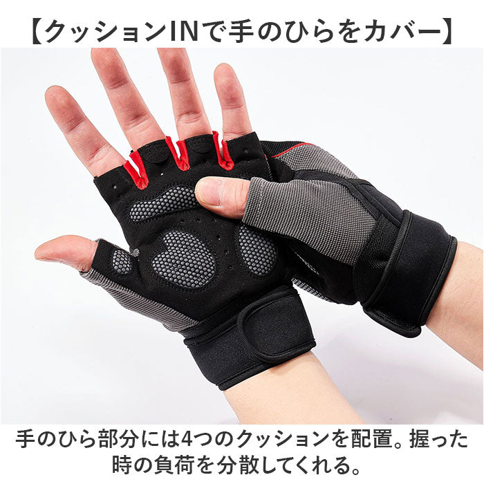 ・手の滑りや傷みをカバーして、トレーニングの効率をUP!しっかりグリップできる滑り止め付。