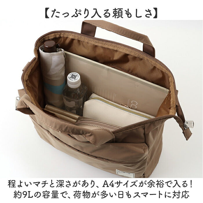 ・程よいマチと深さがあり、A4サイズが余裕で入る!約9Lの容量で、荷物が多い日もスマートに対応