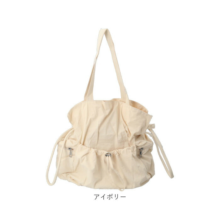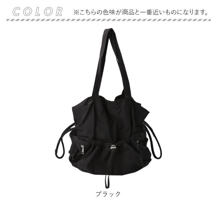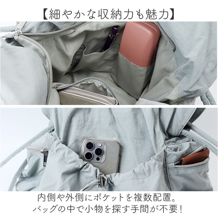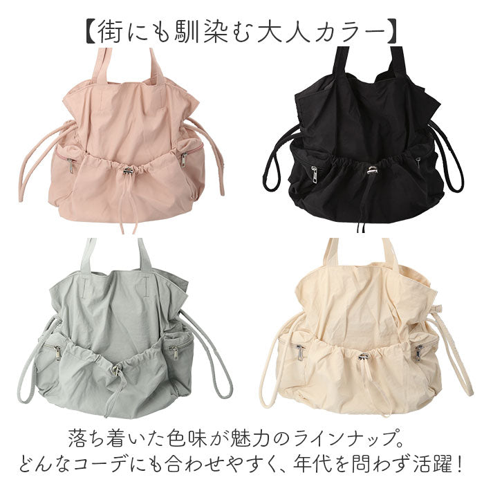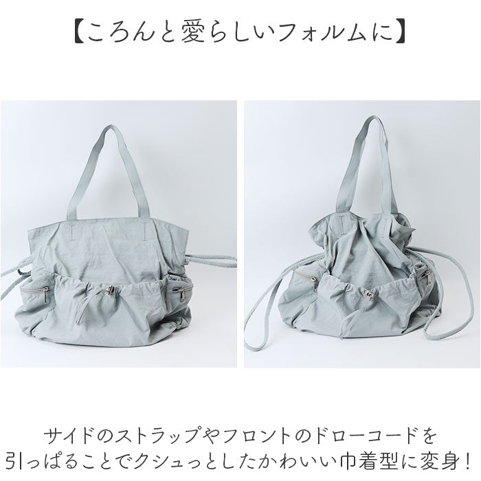 ・サイドのストラップやフロントのドローコードを引っぱることでクシュっとしたかわいい巾着型に変身!