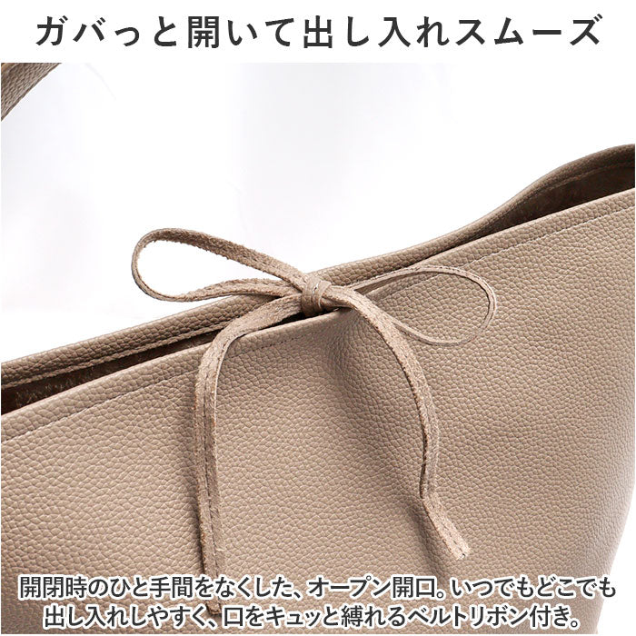 ・開閉時のひと手間をなくした、オープン開口。いつでもどこでも出し入れしやすく、口をキュッと縛れるベルトリボン付き。