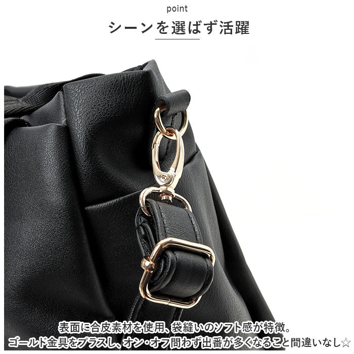 ・表面に合皮素材を使用、袋縫いのソフト感が特徴。ゴールド金具をプラスし、オン・オフ問わず出番が多くなること間違いなし☆