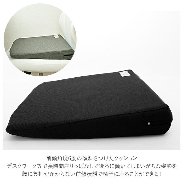 ・ドクターエルクッションは、前傾角度6度の傾斜をつけたクッション。デスクワーク等で長時間座りっぱなしでいることで後ろに傾いてしまいがちな姿勢を、ドクターエルクッションに座ることで腰に負担がよりかからない前傾状態で椅子に座ることができる!