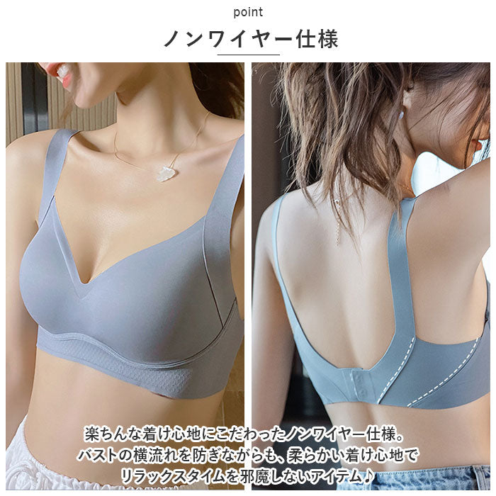 ・楽ちんな着け心地にこだわったノンワイヤー仕様。バストの横流れを防ぎながらも、柔らかい着け心地でリラックスタイムを邪魔しないアイテム♪