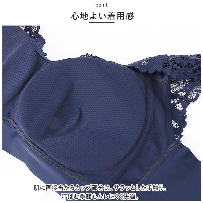 ・肌に直接当たるカップ部分は、サラッとした手触り。汗ばむ季節もムレにくく快適。