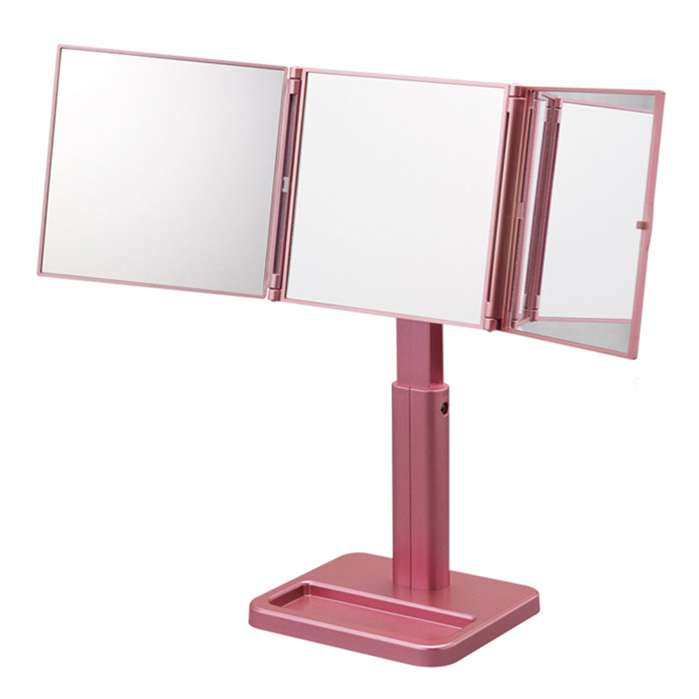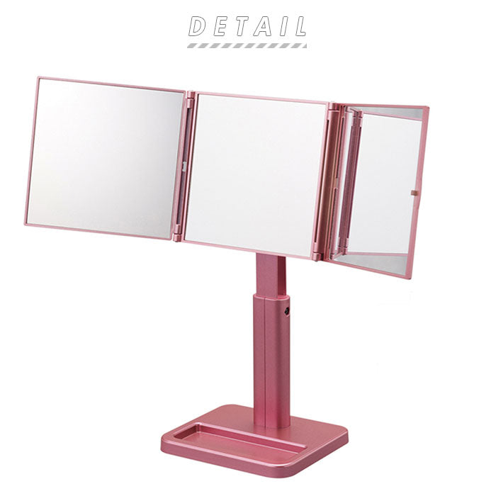 ・三面鏡仕様のミラーは鏡の向きが360度回転し、どんな角度でもピタッと止まる!高さは105mm内で調節可能、さらに角度調節もできるので、お好みの位置に合わせて使うことができる。