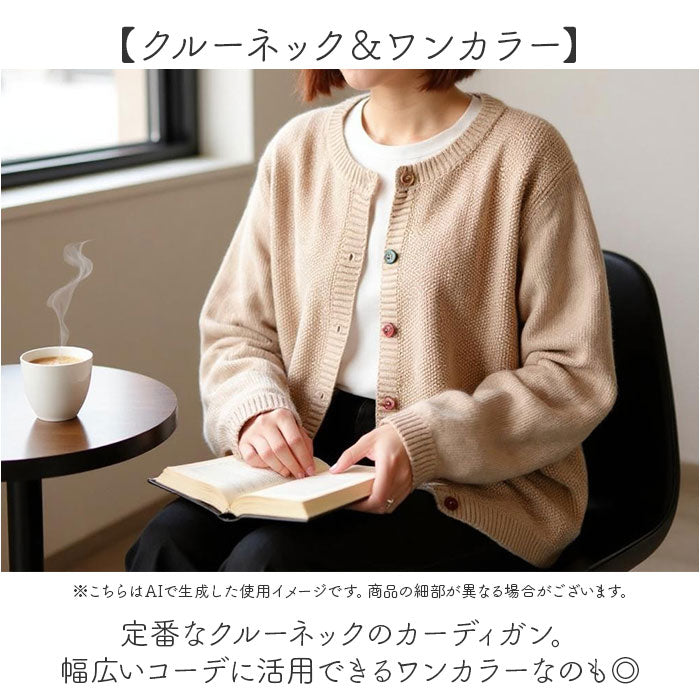 ・定番なクルーネックのカーディガン。幅広いコーデに活用できるワンカラーなのも◎