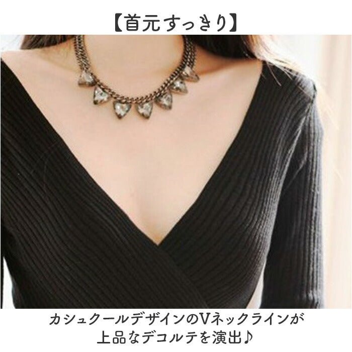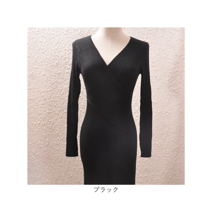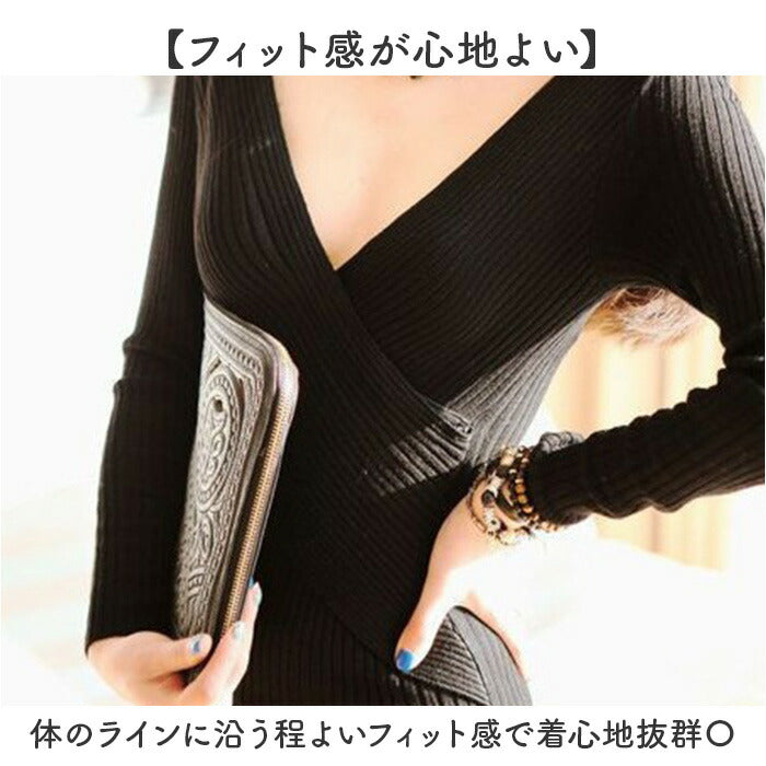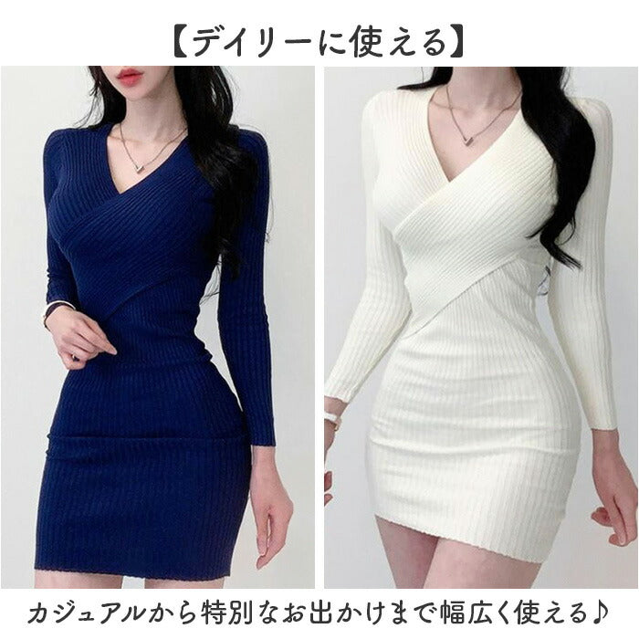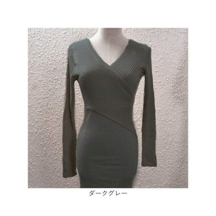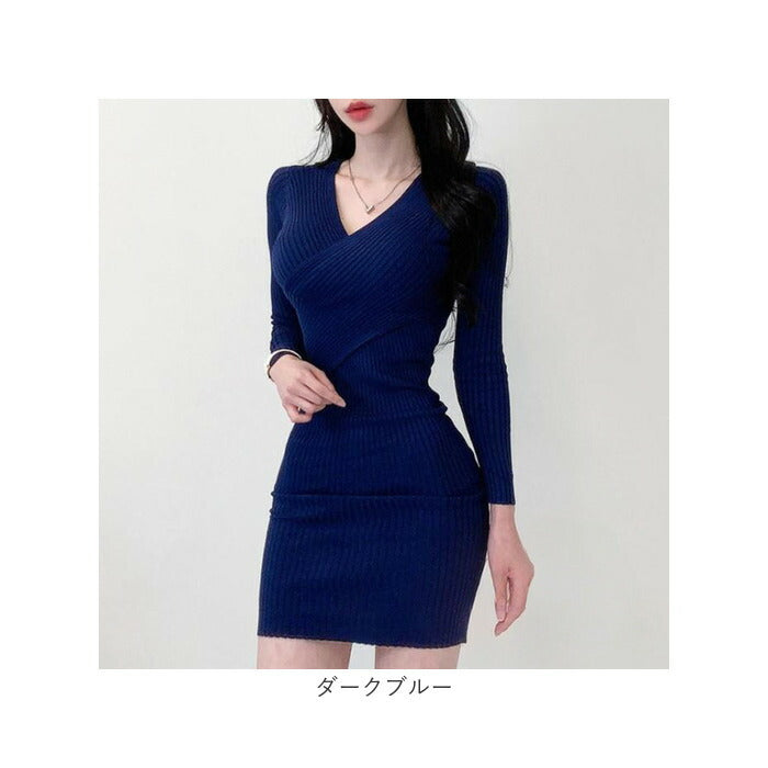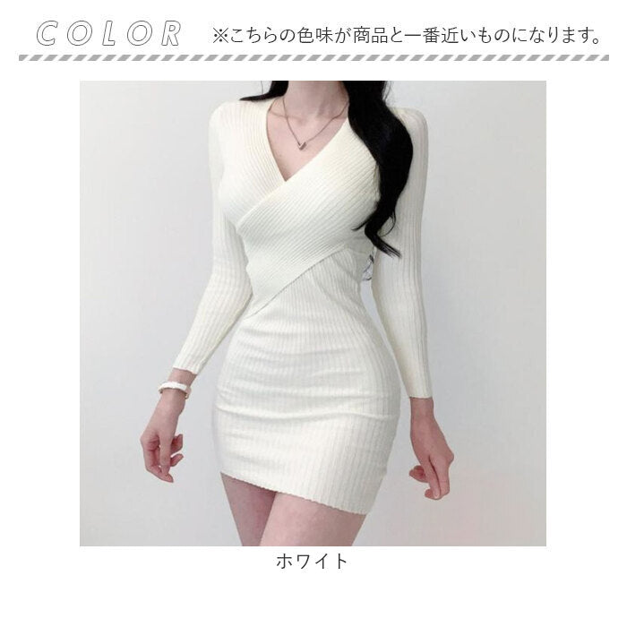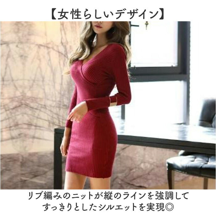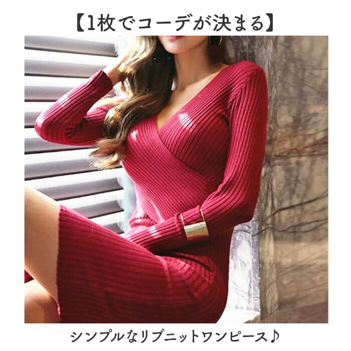 ニットワンピース タイト リブ 長袖 通販 リブニット ワンピース ミニ ミニ丈 ミニワンピ ミニワンピース ミニタイト ニット ワンピ リブ編み Vネック ミニスカート ニットドレス