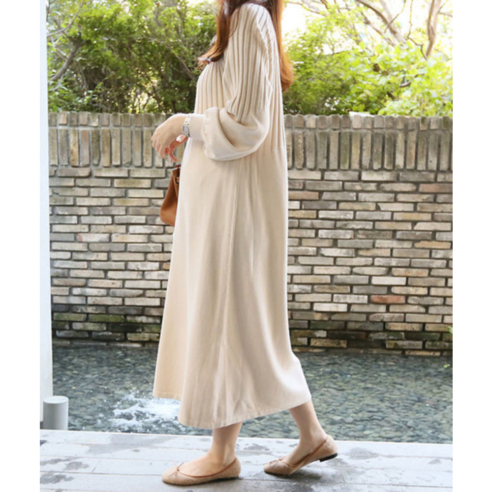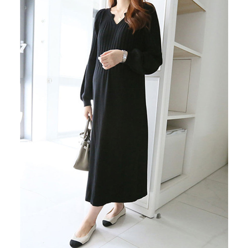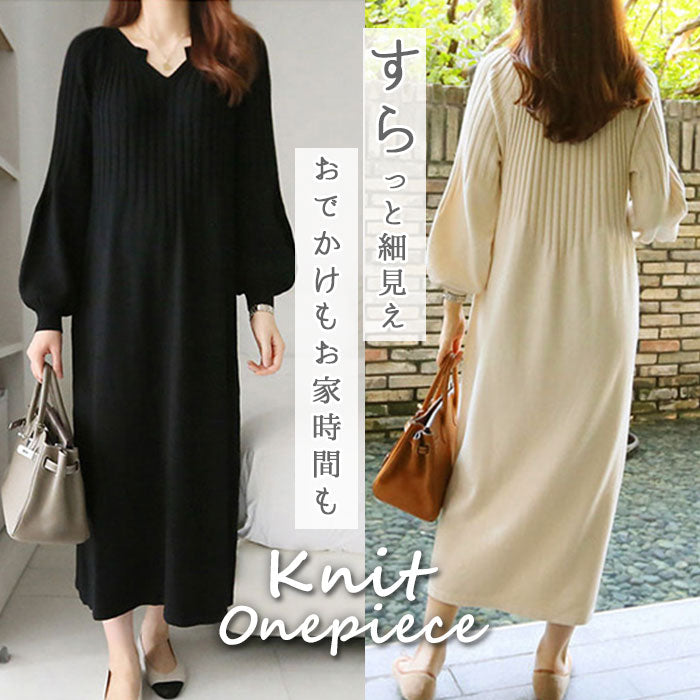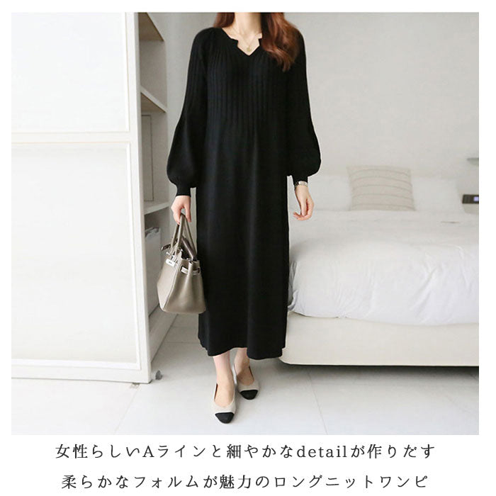ニットワンピース ロング 通販 ワンピース ニット レディース ワンピ ゆったり Vネック Aライン シルエット 長袖 マキシワンピース 秋冬 パフスリーブ カジュアル きれいめ 無地 大人 かわいい シンプル