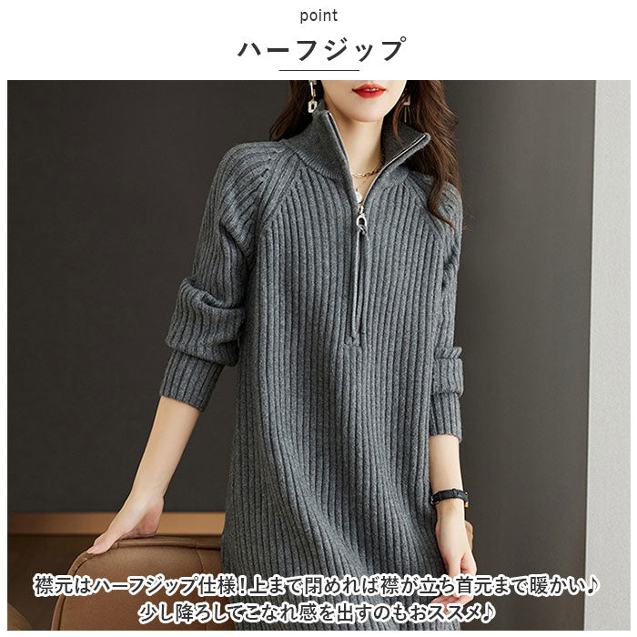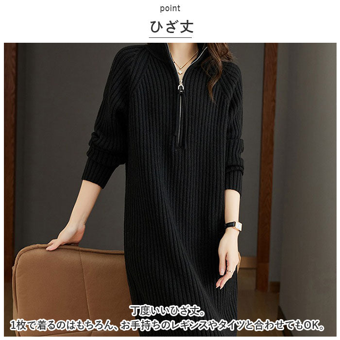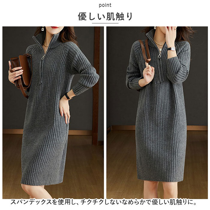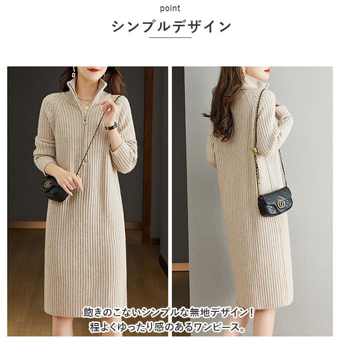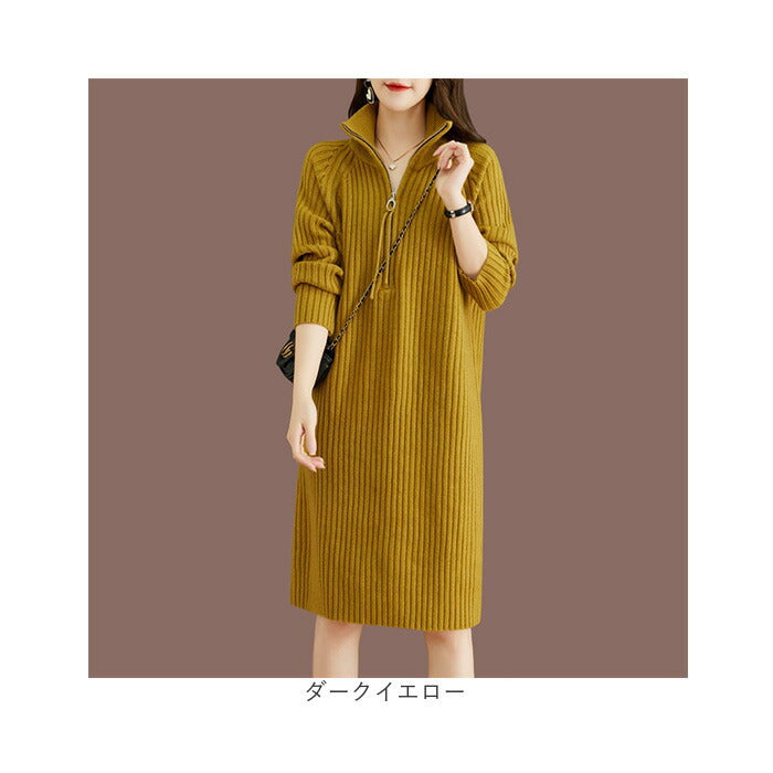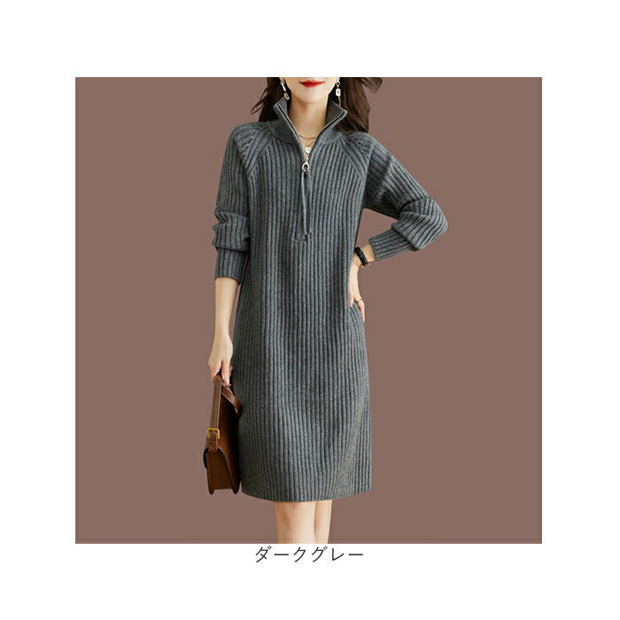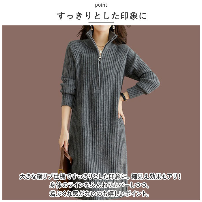ニットワンピース 通販 リブワンピ ワンピース ニット ワンピ 長袖 膝丈 レディース 秋 冬 ハーフジップ シンプル 無地 洗える 通勤 通学 カジュアル きれいめ かわいい カワイイ