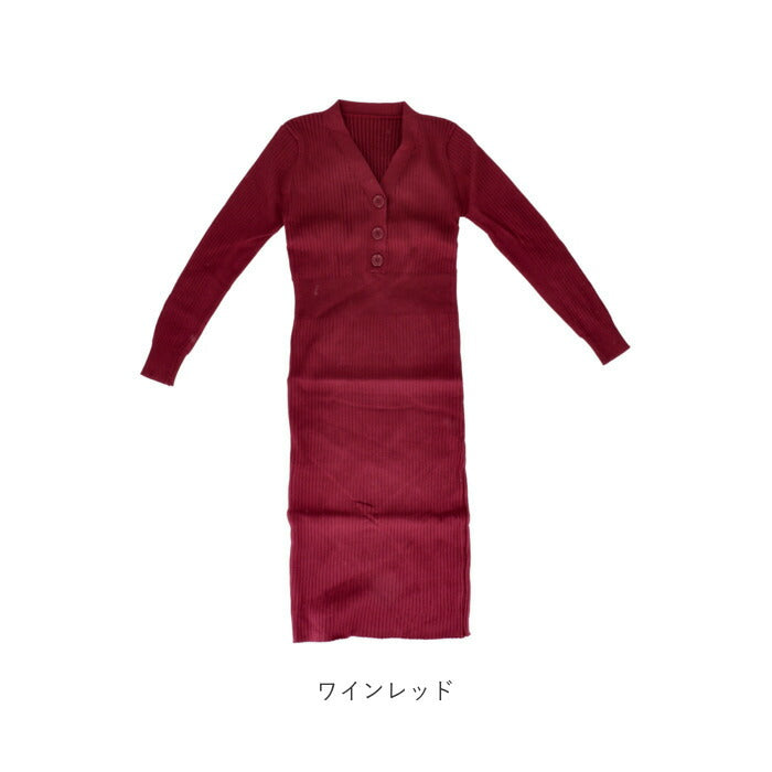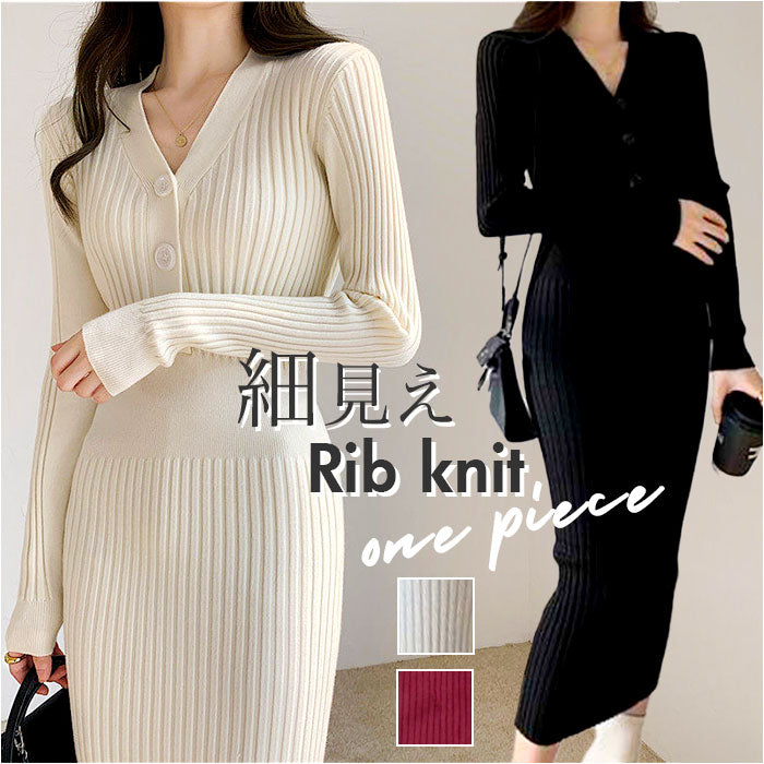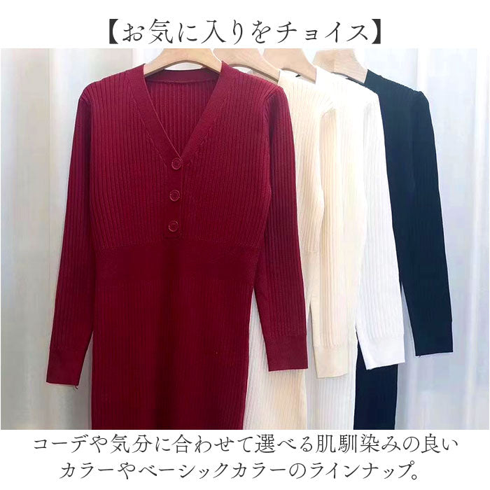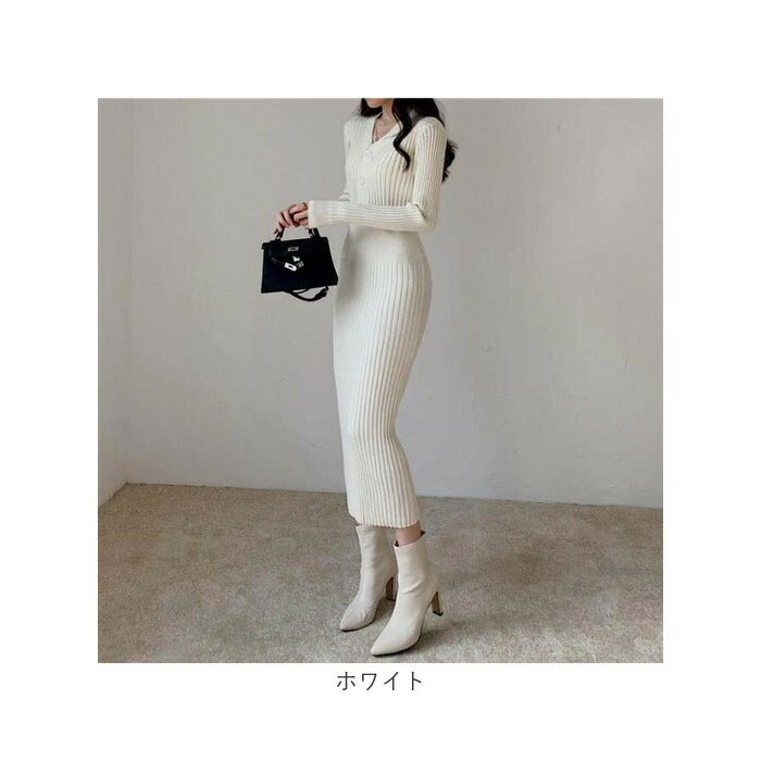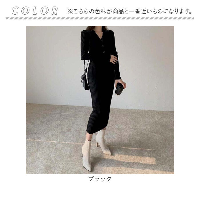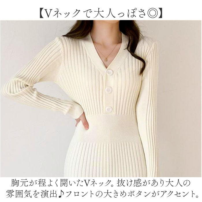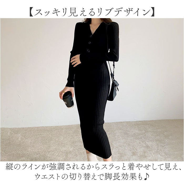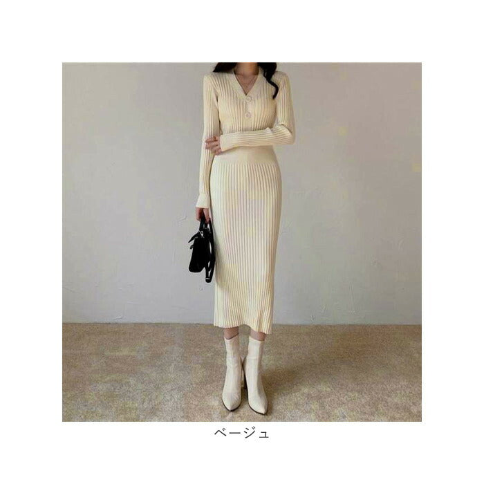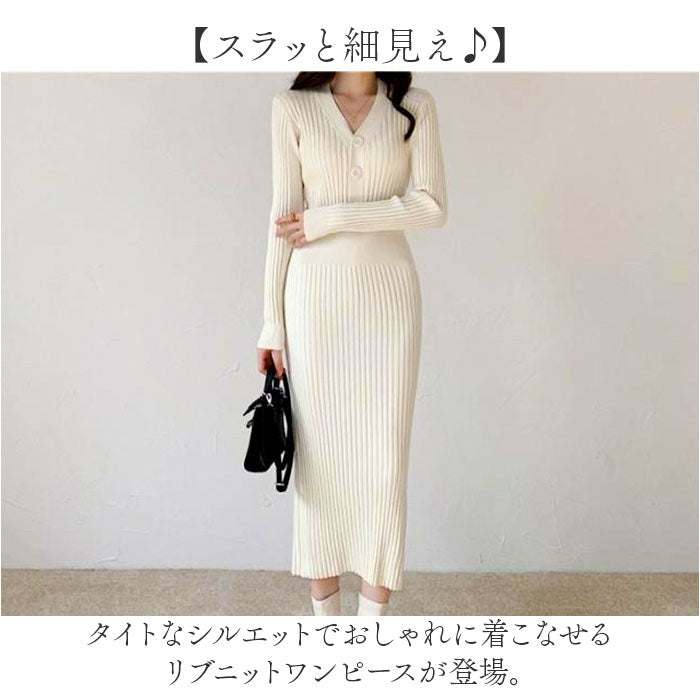 ニットワンピース 長袖 通販 ロング ワンピース ニットワンピ タイトワンピース リブニットワンピ vネック タイト きれいめ フェミニン おしゃれ オシャレ シンプル カジュアル