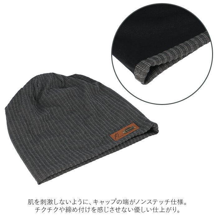 ・肌を刺激しないように、キャップの端がノンステッチ仕様。チクチクや締め付けを感じさせない優しい仕上がり。