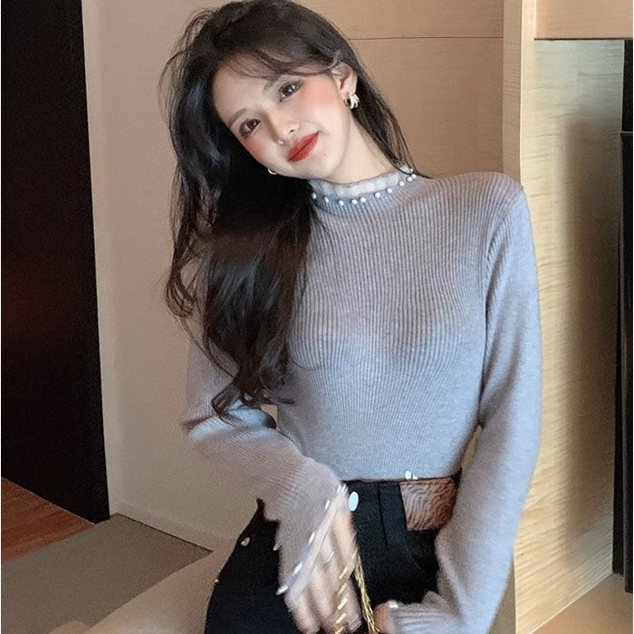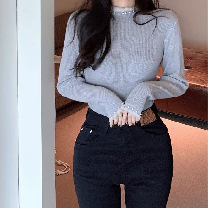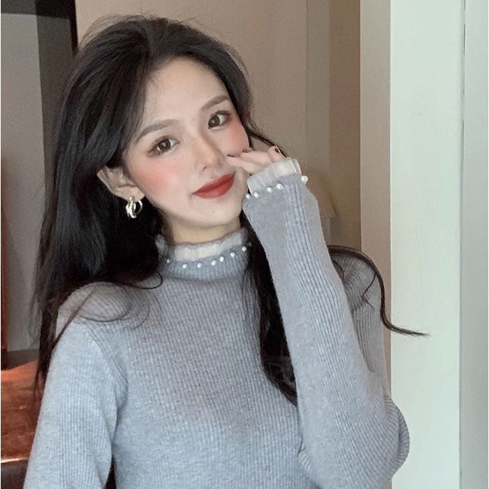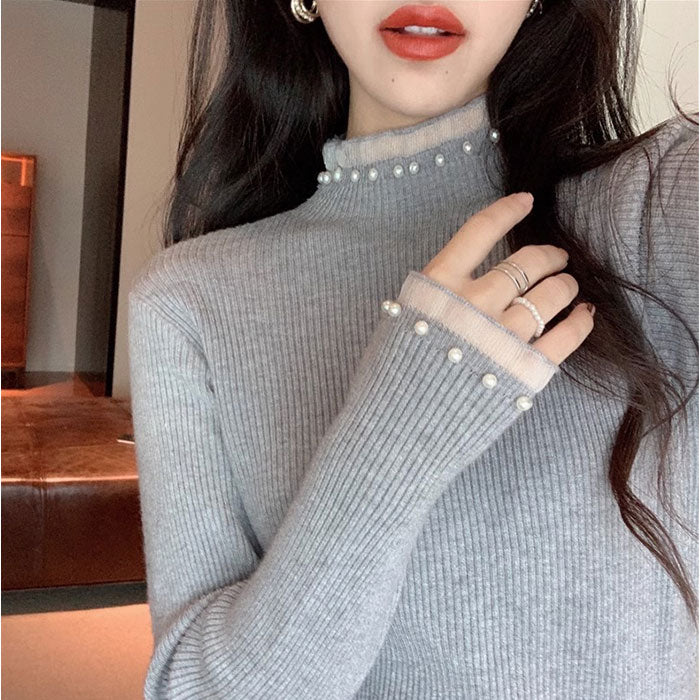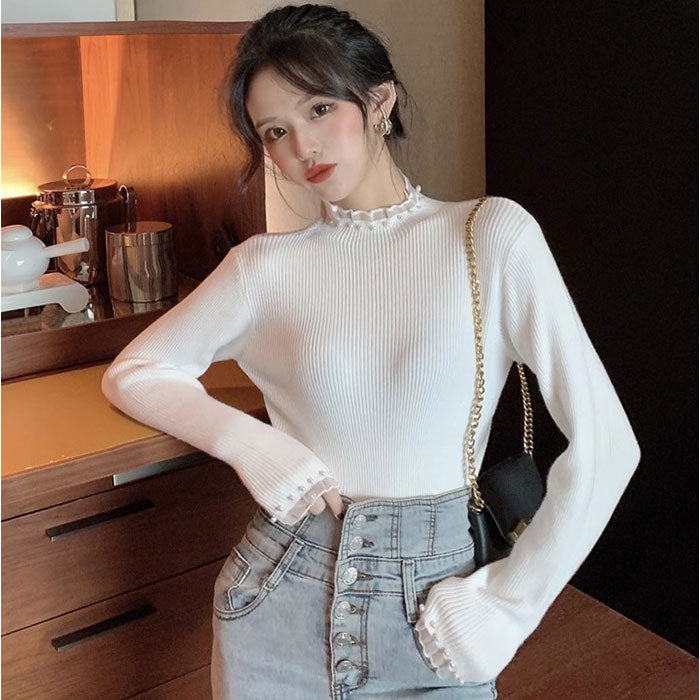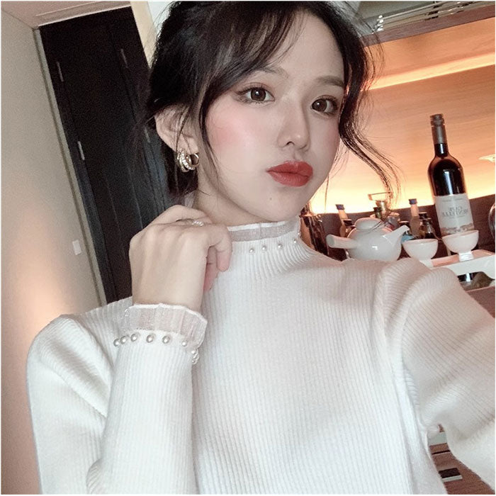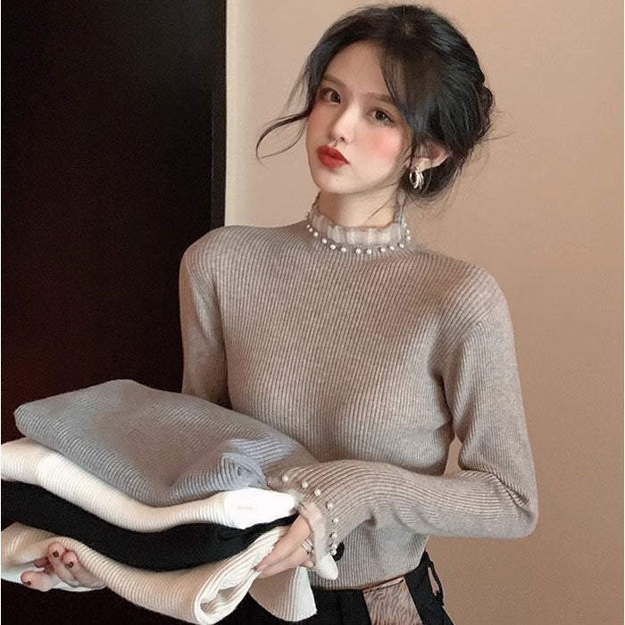 ニット レディース 長袖 通販 セーター ニットセーター ニットトップス ハイネック インナー パールネック モックネック フリル パール 冬 秋冬 おしゃれ シンプル 無地 オシャレ