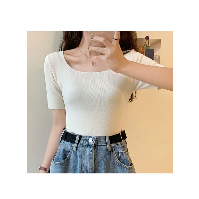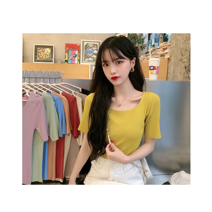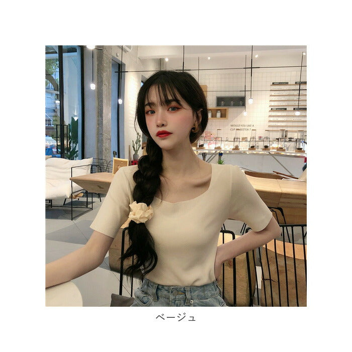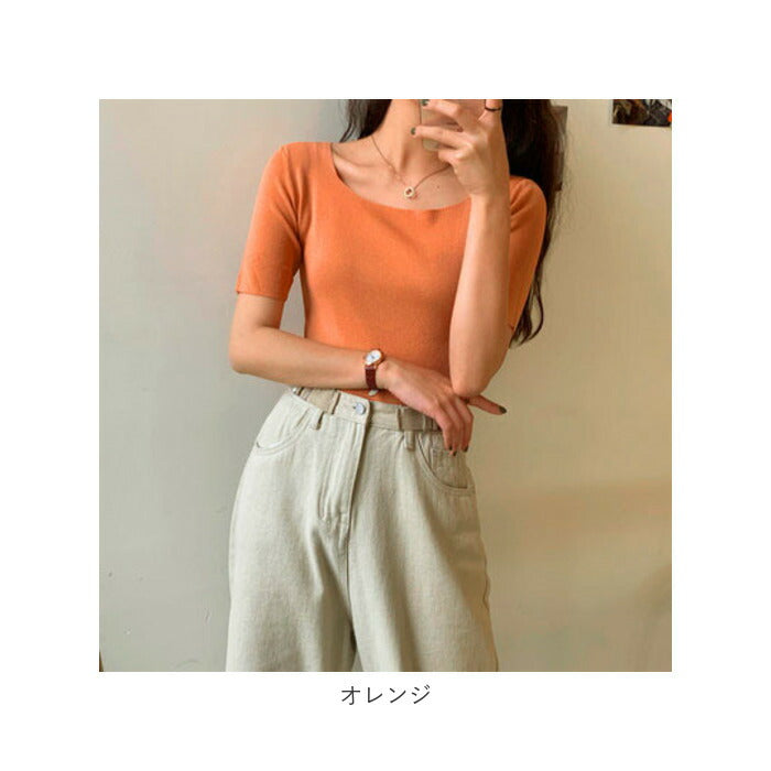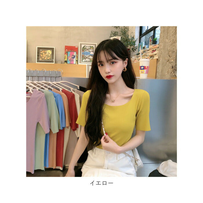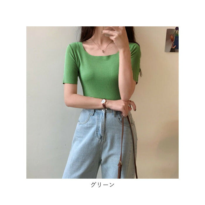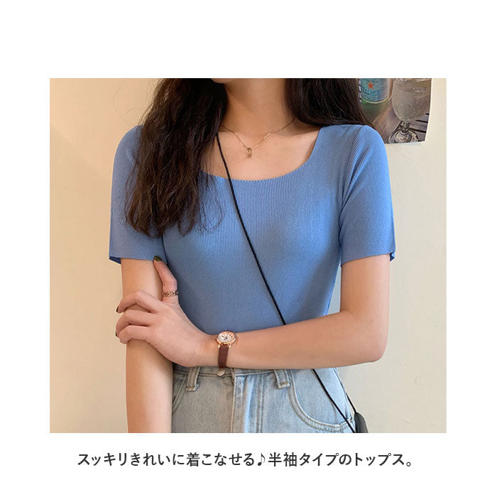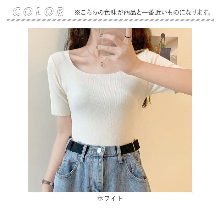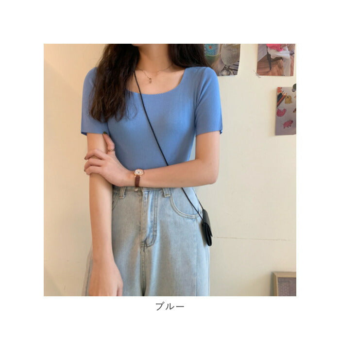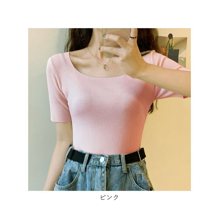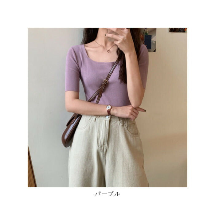 ニット 半袖 通勤 スクエア スクエアネック 通販 Tシャツ セーター タイト スリム フィット プルオーバー 春 夏 薄手 上品 無地 シンプル きれいめ 着回し トップス おしゃれ