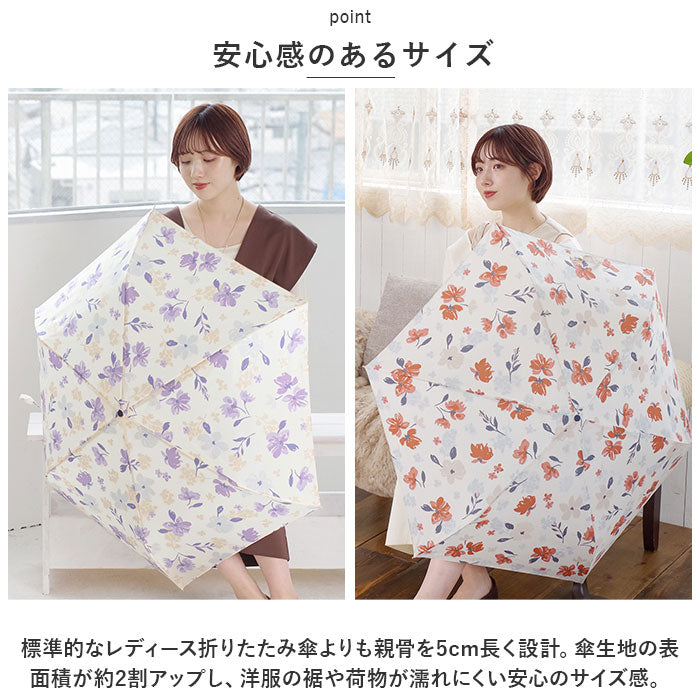 ・標準的なレディース折りたたみ傘よりも親骨を5cm長く設計。傘生地の表面積が約2割アップし、洋服の裾や荷物が濡れにくい安心のサイズ感。