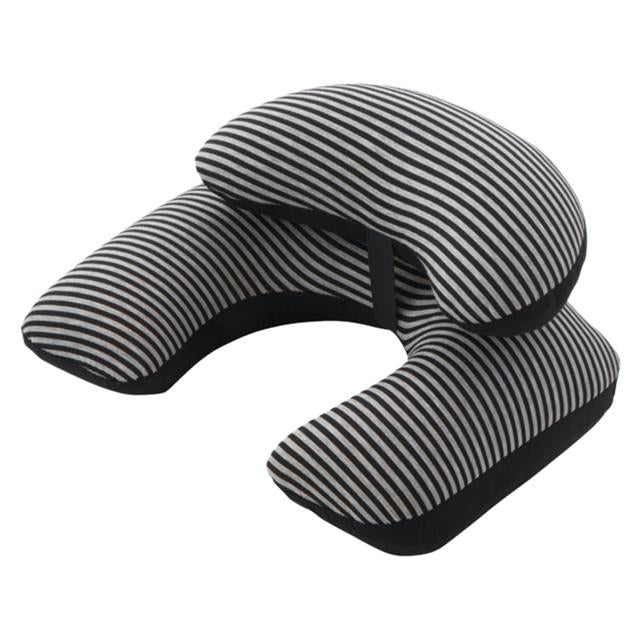 快適な長期旅行やフライトの必需品!取り外し可能な大・小二つの2段式トラベルクッションです。安心の日本製です。クッション上部を動かしてゴムテープでお好みの位置に動かせます。機内やバスなどで頭部を快適に支えてくれます。また、単品でもお使いいたただけるので、状況やお好みに合わせた使いかたができます。