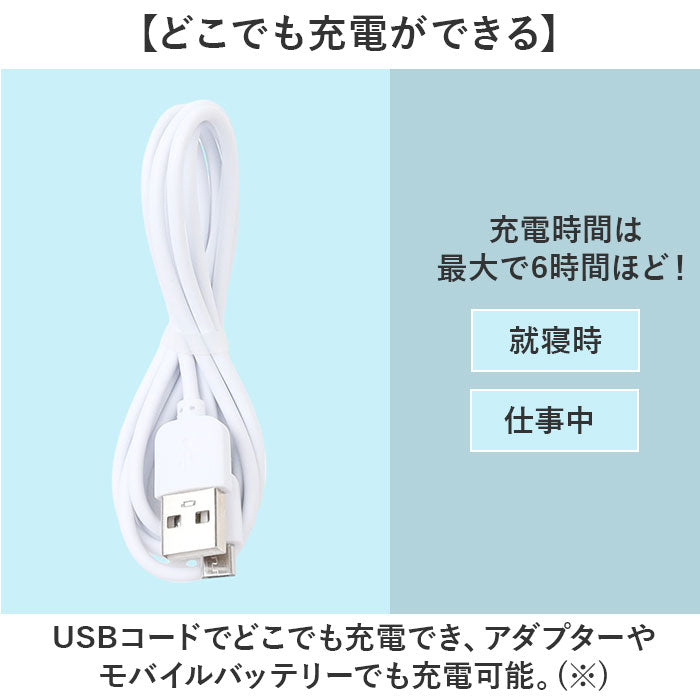 ・USBコードでどこでも充電でき、アダプターやモバイルバッテリーでも充電可能。