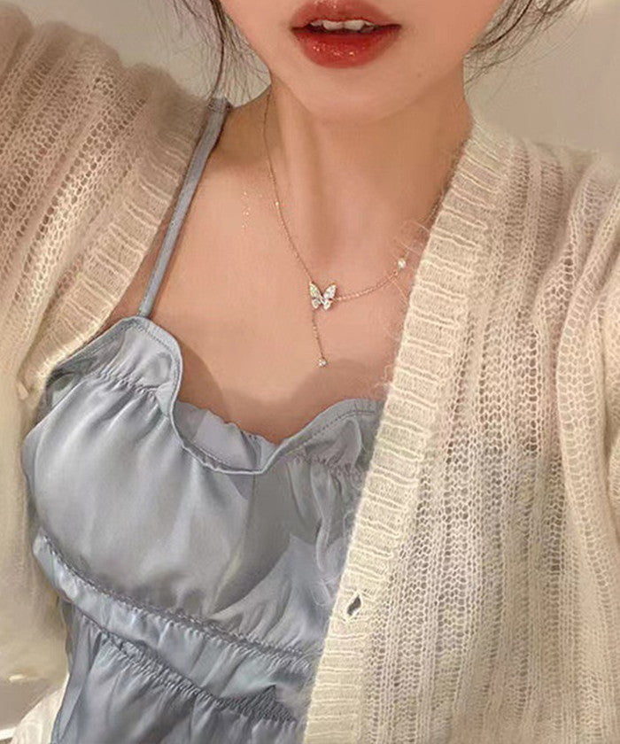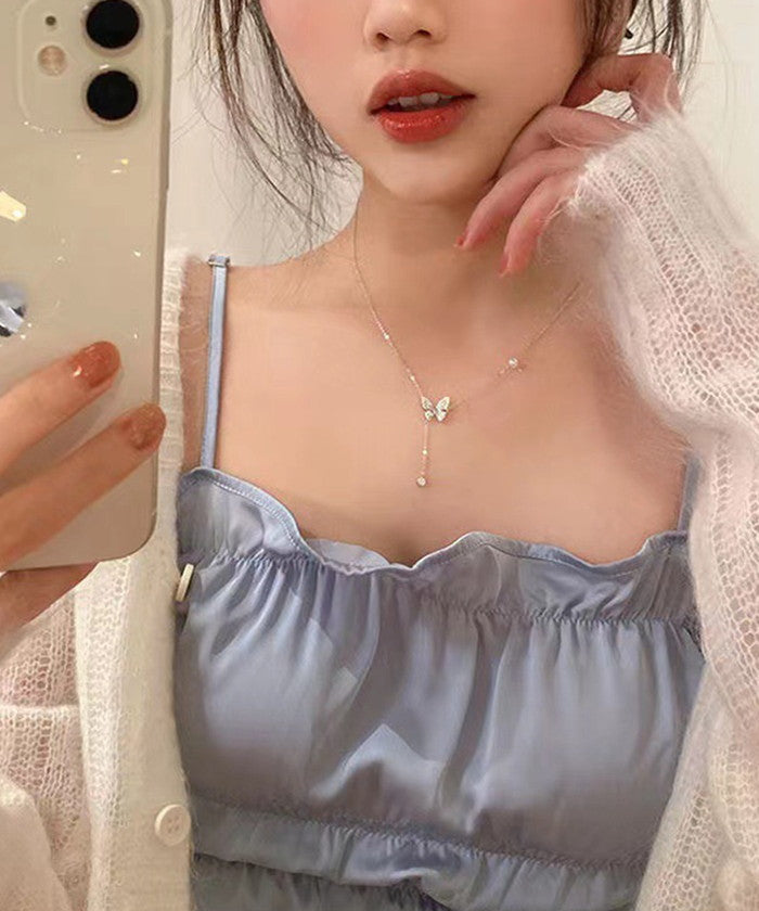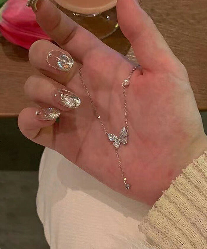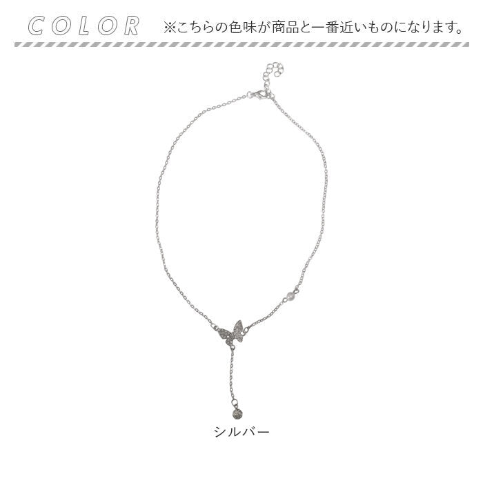 ・きらりと輝く蝶々のモチーフとチェーン部分のパールがアクセントとなった上品なネックレス。