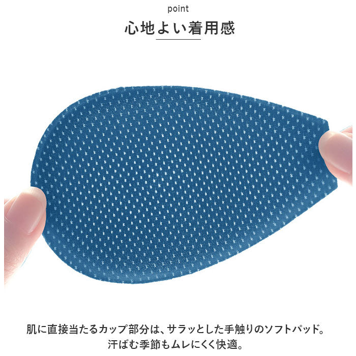 ・肌に直接当たるカップ部分は、サラッとした手触りのソフトパッド。汗ばむ季節もムレにくく快適。