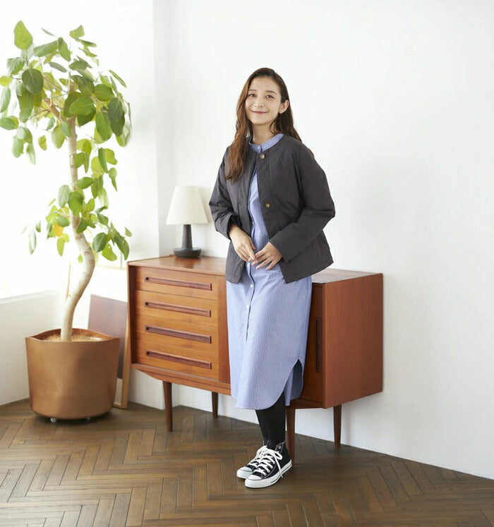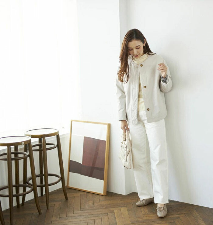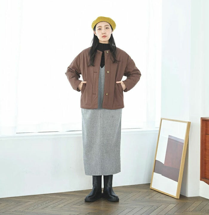 ・シンプルなノーカラーダウンジャケットは、どんな服にもなじみやすい、ナチュラルなカラー展開。