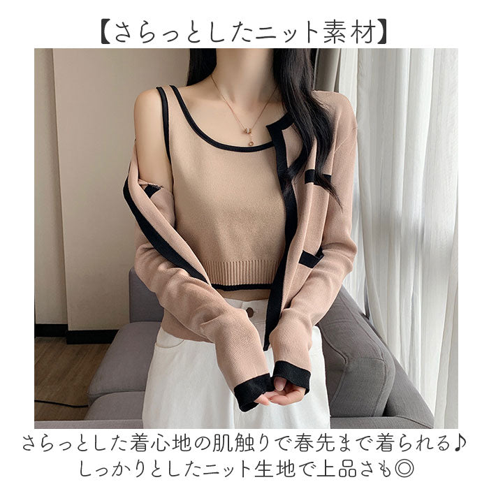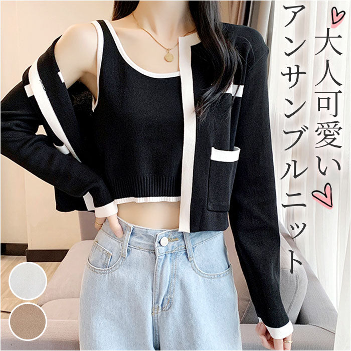 ノースリーブニット アンサンブル 通販 タンクトップ ニット キャミソール ショート丈 トップス カーディガン セット 長袖 かわいい 可愛い おしゃれ バイカラー 前開き シンプル