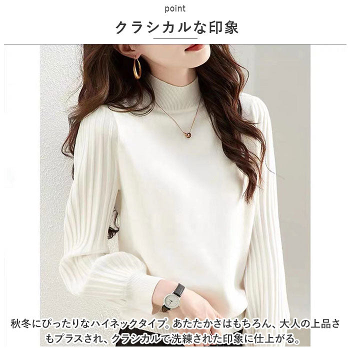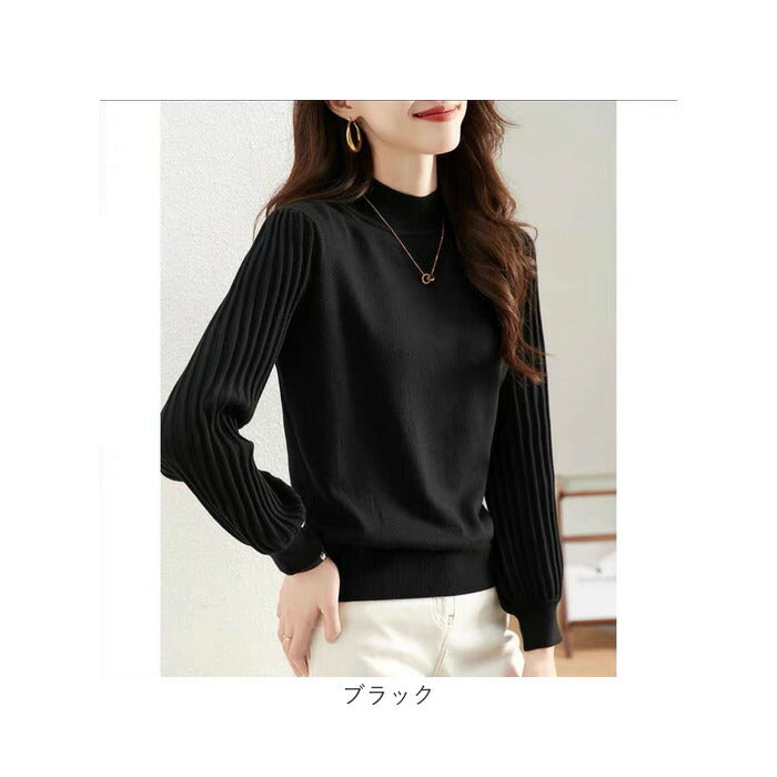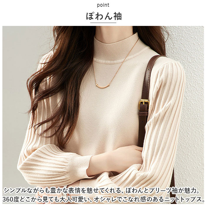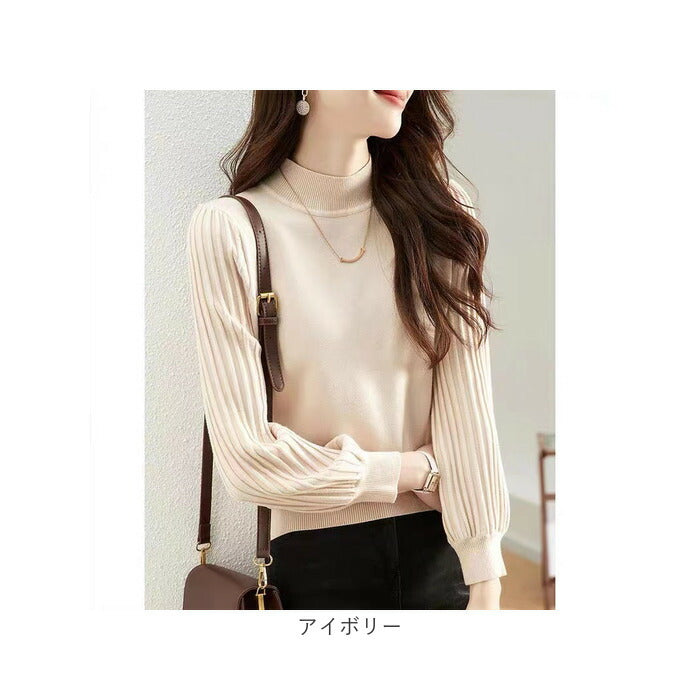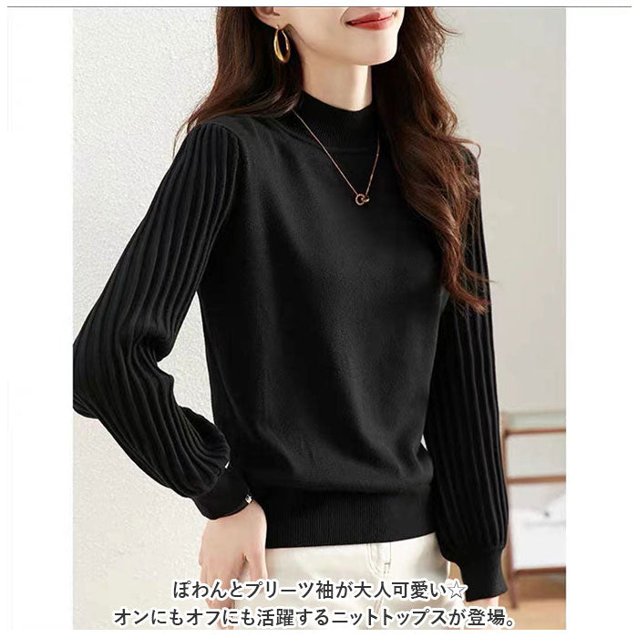 ハイネック ニット 秋冬 レディース 通販 セーター ハーフタートルネック 薄手 秋 冬 薄い 長袖 プリーツ 袖 パフスリーブ ボリュームスリーブ 袖コンシャス おしゃれ シンプル 大人