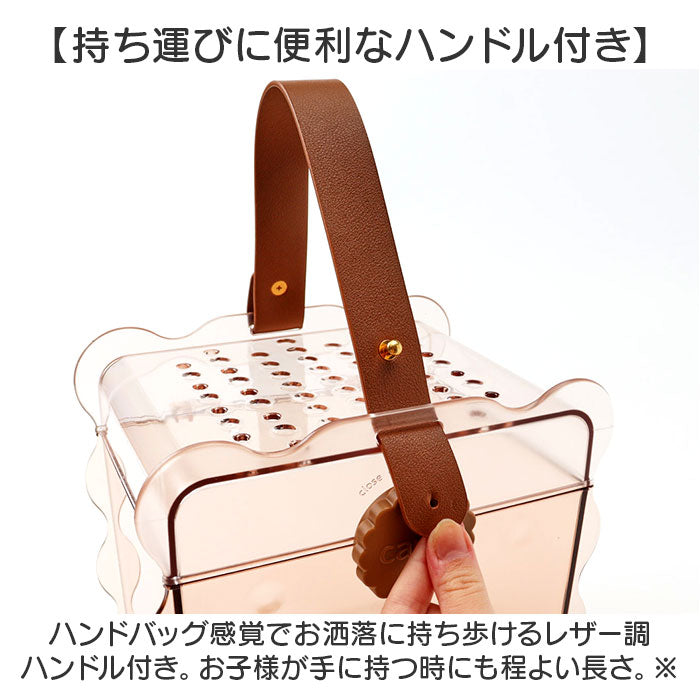 ・ハンドバッグ感覚でお洒落に持ち歩けるレザー調ハンドル付き。お子様が手に持つ時にも程よい長さ。