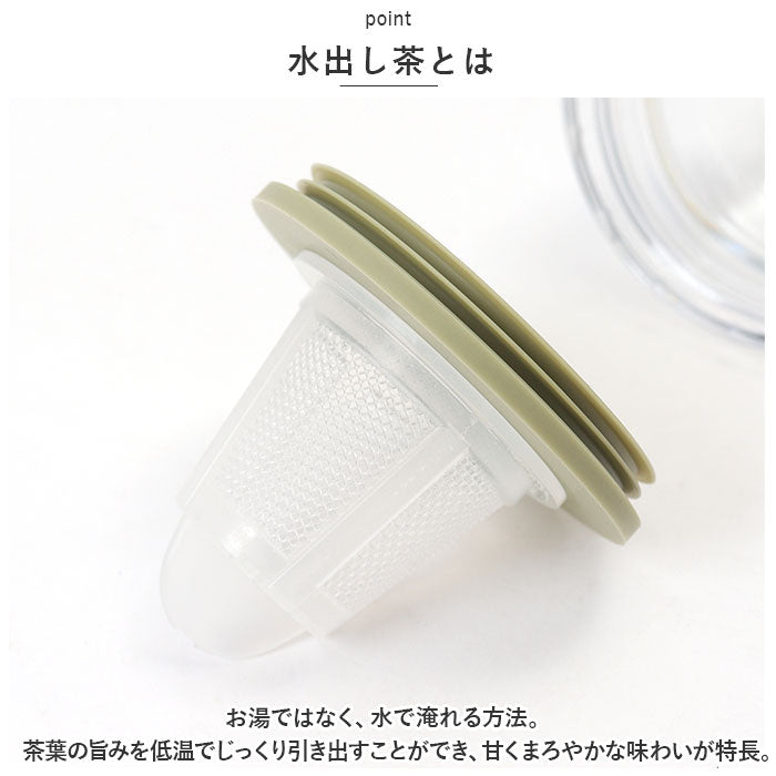 ・注ぎ口部分にフィルターメッシュがセットされた、ボトルタイプの水出し茶ポット。ドリンクを作ってそのまま飲める&持ち運べる便利アイテム!