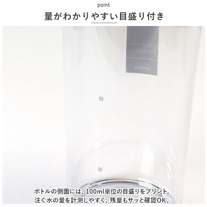 ・ボトルの側面には、100ml単位の目盛りをプリント。注ぐ水の量を計測しやすく、残量もサッと確認OK。