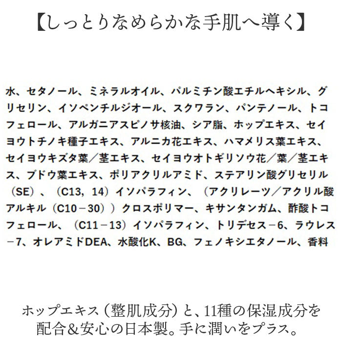 ・ホップエキス(整肌成分)と、11種の保湿成分を配合&安心の日本製。手に潤いをプラス。