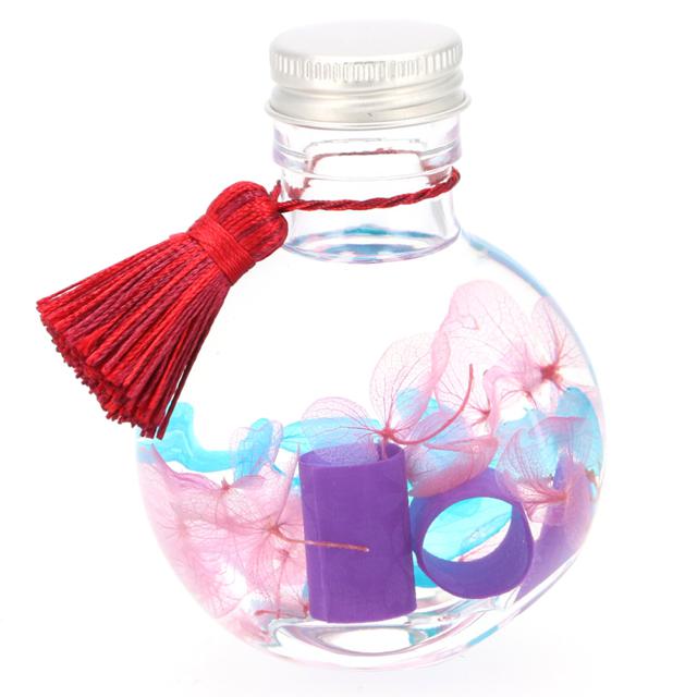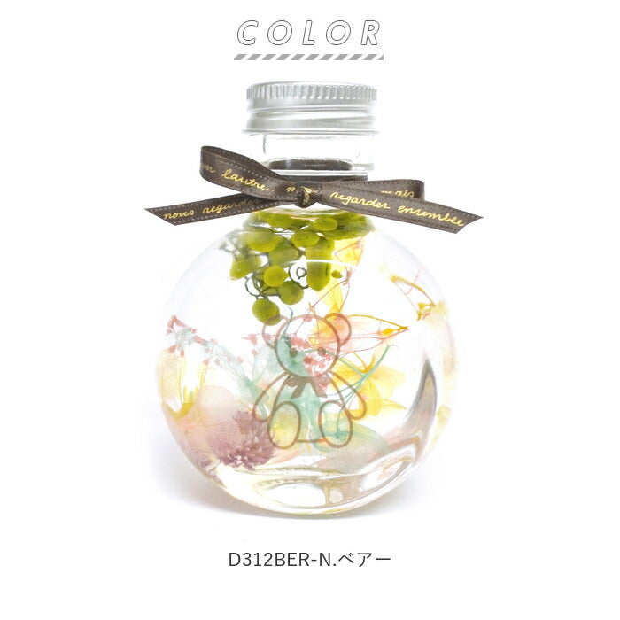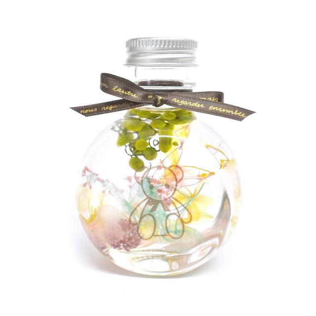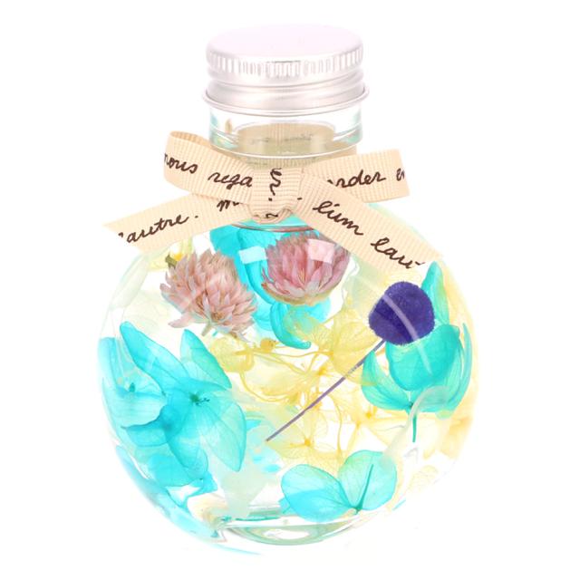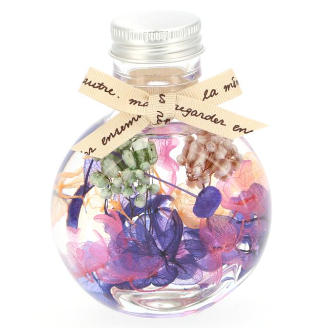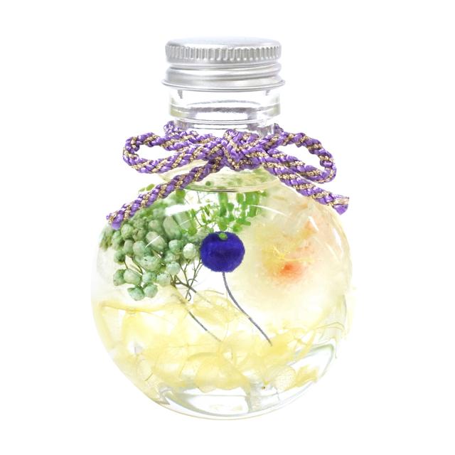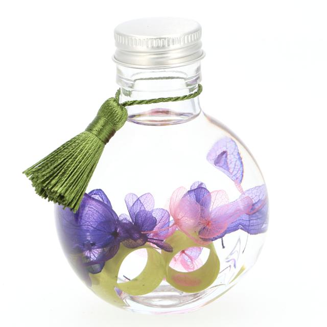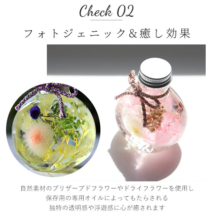 ・自然素材のプリザーブドフラワーやドライフラワーを使用し、保存用の専用オイルによってもたらされる独特の透明感や浮遊感に心が癒される…。※安全性を考慮して、花材の着色には食用染料を使用しているためオイルに色移りする場合がありますが、不良品ではありません。