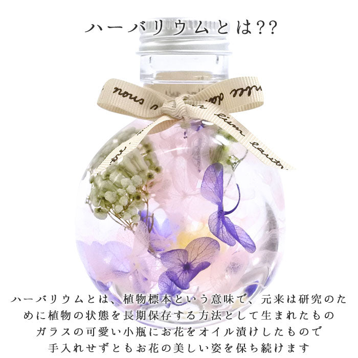 ・ハーバリウムとは…ガラスの可愛い小瓶にお花をオイル漬けしたもの。お手入れなしでも美しい姿を保ち続け、お花本来のみずみずしさを長期間保つことができるので、どんな方でも気軽に楽しめるインテリアフラワーとして人気が高い。