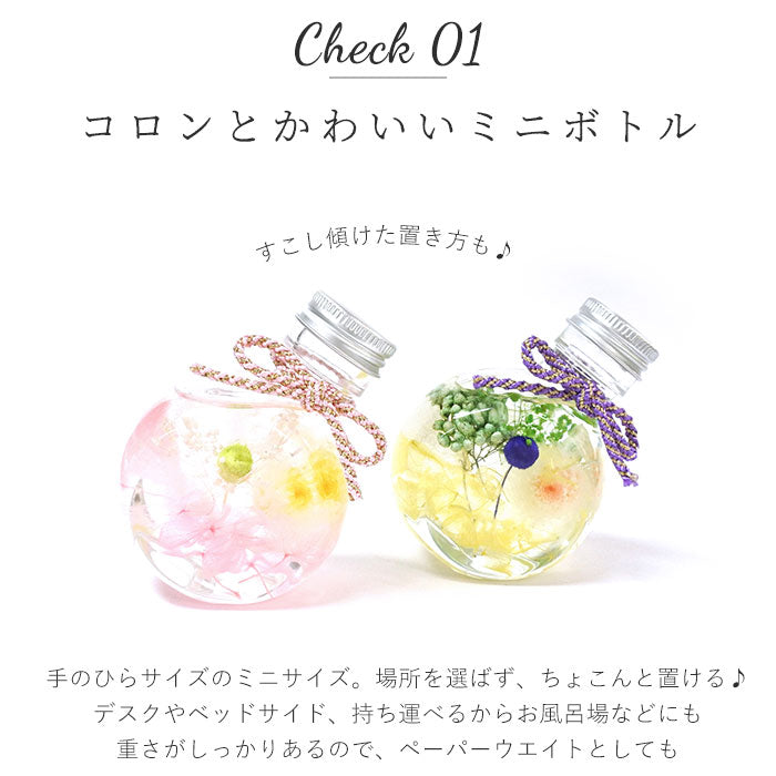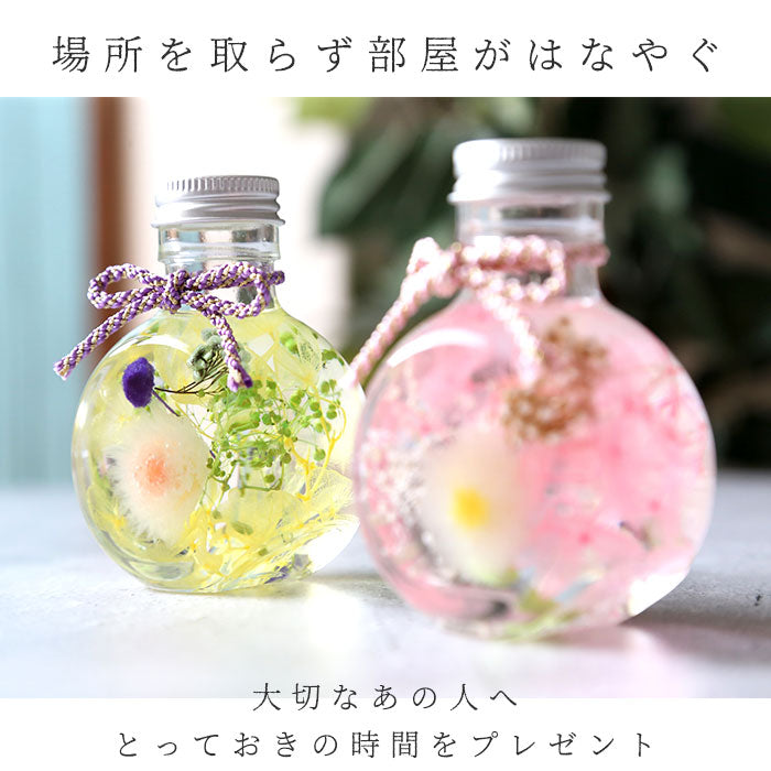 ・ガラスボトルの中で、優雅に漂う美しいお花に心癒されるインテリア・ハーバリウム。場所を選ばず飾れる、コンパクトなミニボトル。