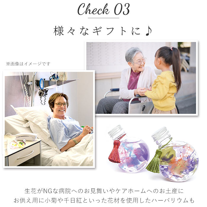 ・かわいいインテリアとしてはもちろん、お供え用に小菊や千日紅といった花材を使用したハーバリウムも選べるので、手元供養としても使える。