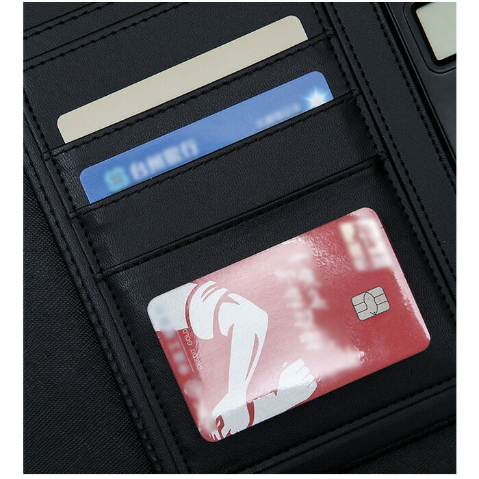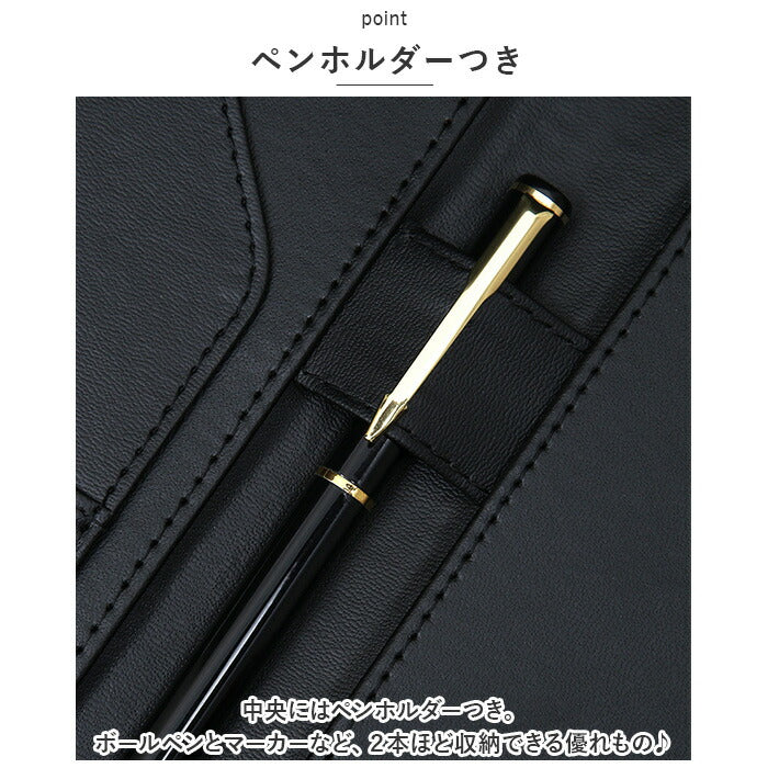 ・名刺や社員証などが入るカードポケット×4(1つはクリア窓仕様)、書類を収納できるポケット×2、電卓やミラーを収納できるポケット×1を装備し、機能性◎