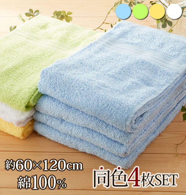バスタオル 通販 同色4枚セット ピクニックカラー まとめ買い 薄手 乾きやすい 綿 100% 60×120cm シンプル 無地 コットン 普段使い お風呂 バス 白 ホワイト 青 ブルー 緑 グリーン 黄色 イエロー