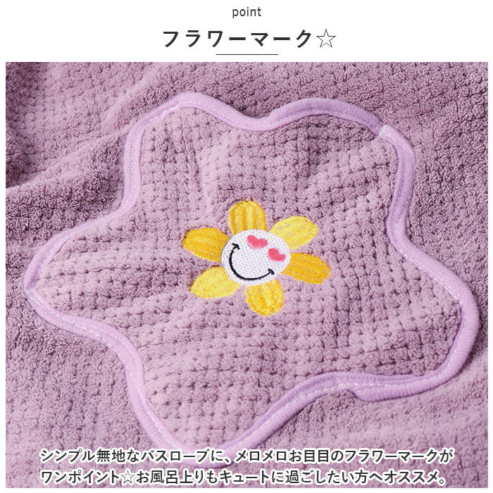 ・シンプル無地なバスローブに、メロメロお目目のフラワーマークがワンポイント☆お風呂上りもキュートに過ごしたい方へオススメ。