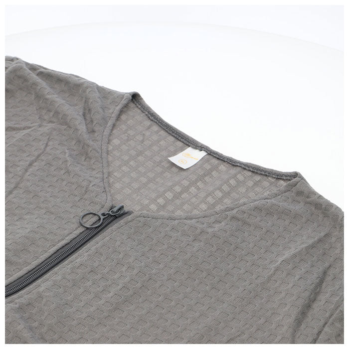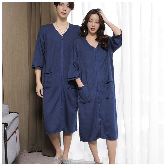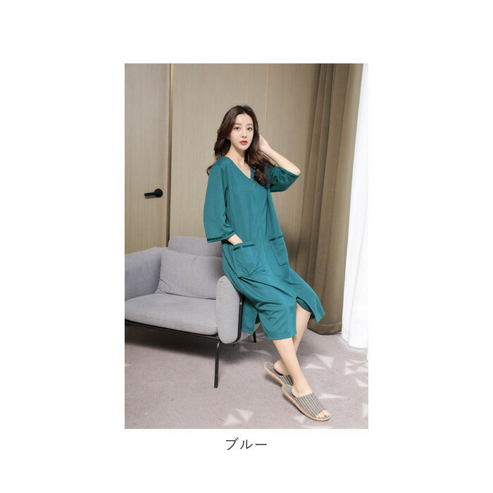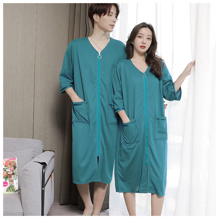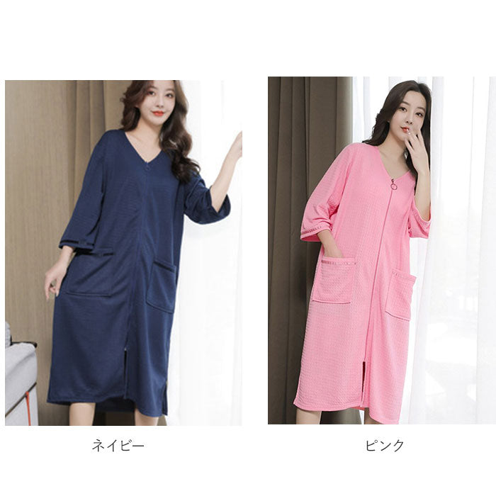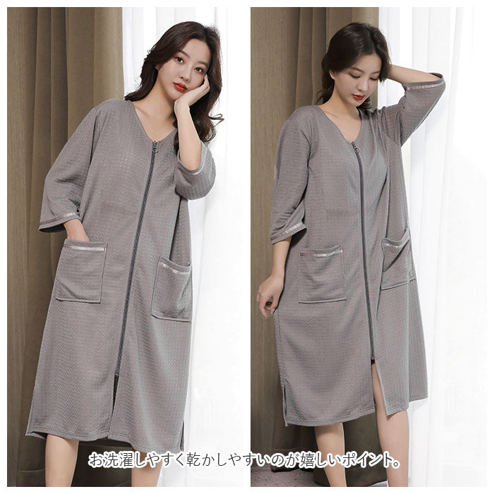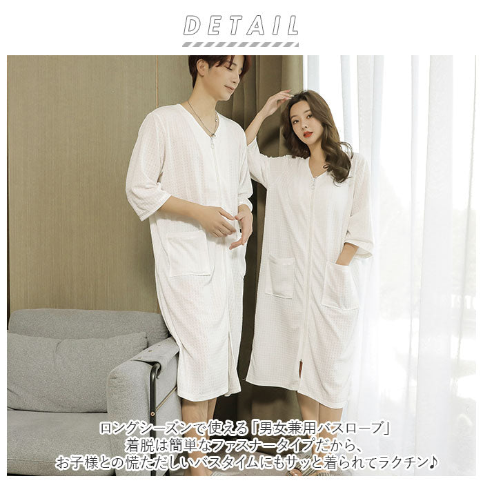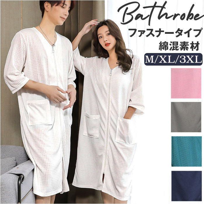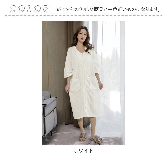 バスローブ ワッフル 通販 薄手 薄地 レディース ママ メンズ ユニセックス 男女兼用 ガウン ナイトガウン 前開き ファスナー ジッパー ポケット付き 吸水 吸湿 長袖 七分袖 お風呂