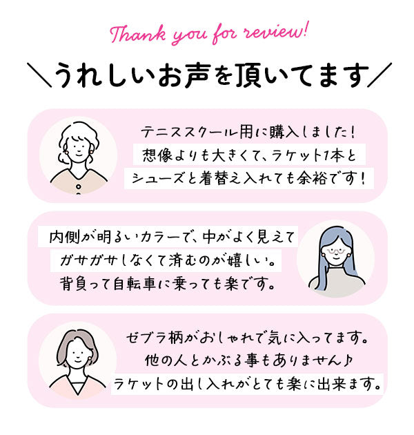 両脇にはメッシュポケットがあり、ペットボトル飲料などを入れられます。テニスラケット入れやマザーズバッグにもおすすめです。