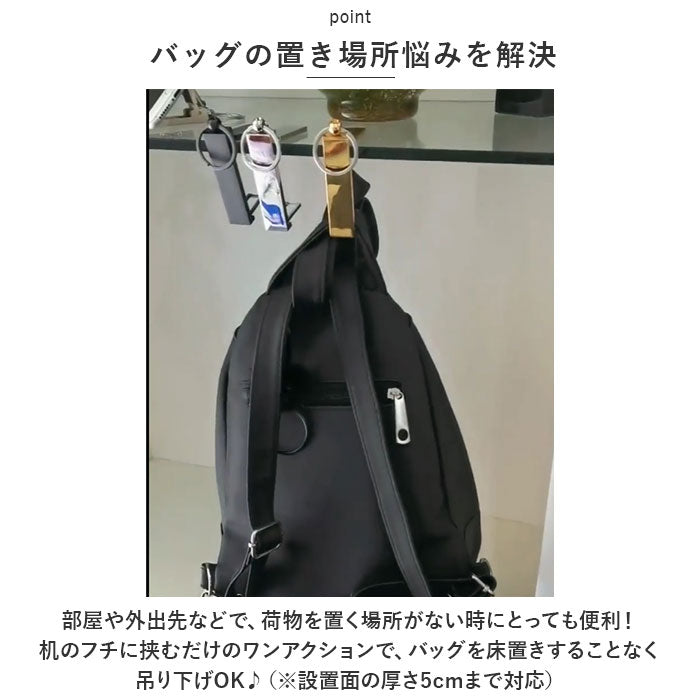 ・部屋や外出先などで、荷物を置く場所がない時にとっても便利!机のフチに挟むだけのワンアクションで、バッグを床置きすることなく吊り下げOK♪(※設置面の厚さ5cmまで対応)