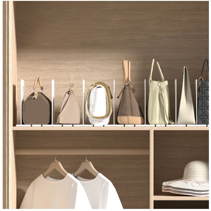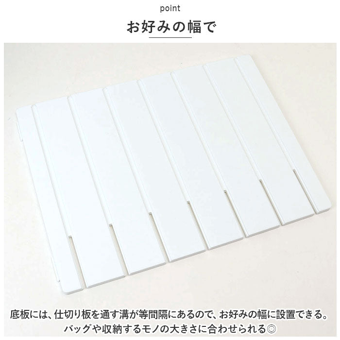 ・底板には、仕切り板を通す溝が等間隔にあるので、お好みの幅に設置できる。バッグや収納するモノの大きさに合わせられる◎