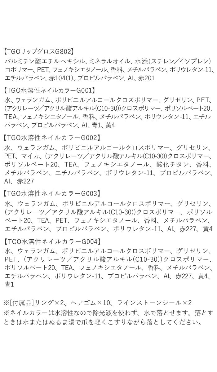 ・リップグロス(6個)、リップスティック(2個)、ネイルカラー(4色)、へアゴム(10個)、リング(2個)、ステッカー(2枚)