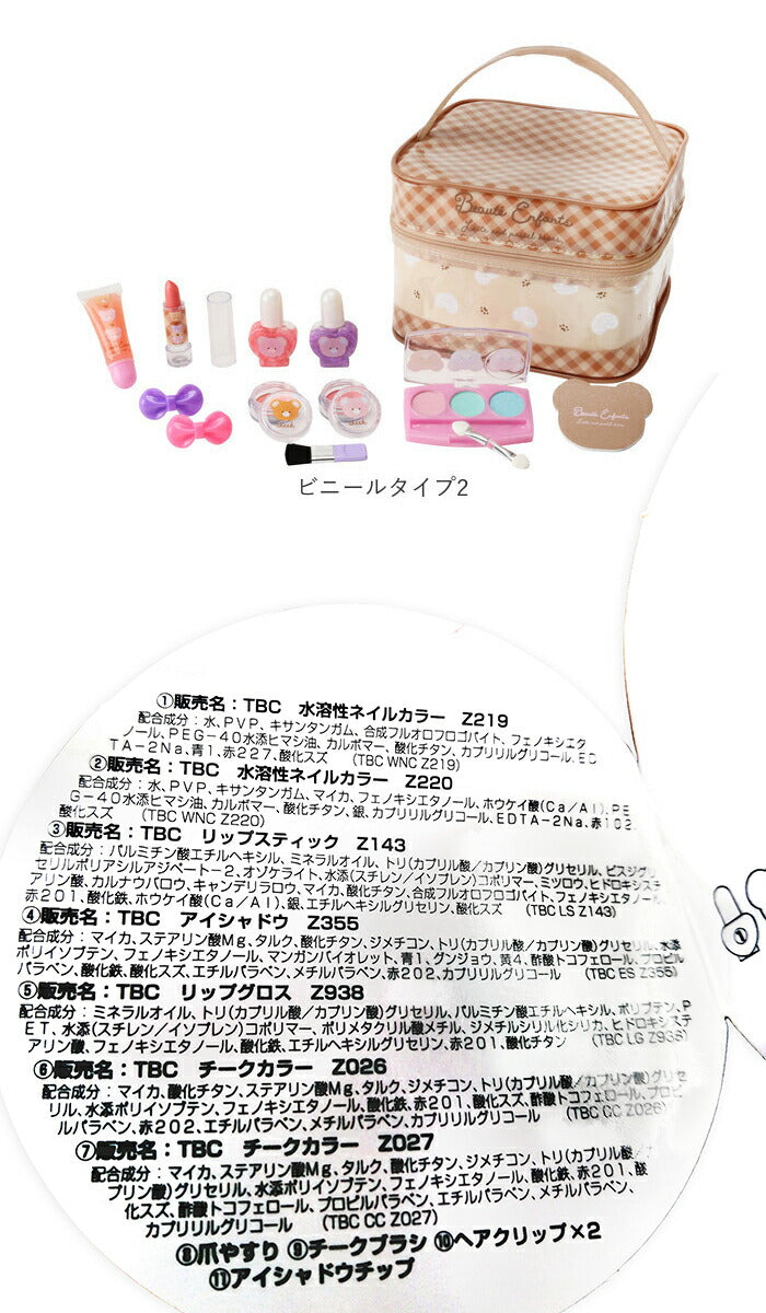 ・リップグロス(1個)、リップスティック(1個)、ネイルカラー(2色)、チークカラー(2色)、アイシャドウパレットチップ付き(3色入り1個)、爪やすり(1個)、チークブラシ(1個)、ヘアクリップ(2個)