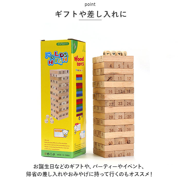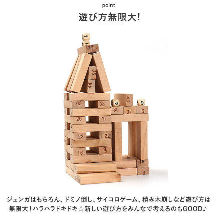 ・ジェンガはもちろん、ドミノ倒し、サイコロゲーム、積み木崩しなど遊び方は無限大!ハラハラドキドキ☆新しい遊び方をみんなで考えるのもGOOD♪
