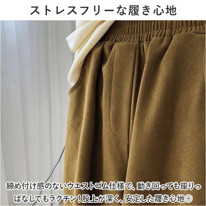 ・締め付け感のないウエストゴム仕様で、動き回っても座りっぱなしでもラクチン!股上が深く、安定した履き心地をプラス。