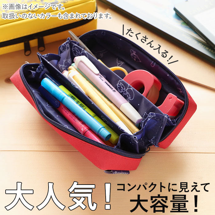・ファスナーを閉じた状態では、ごく普通の長方形のポーチ型ペンケース。ファスナーを開けると、中央のルームが持ち上がり、3つのトレーに分かれる機能的なペンケース!