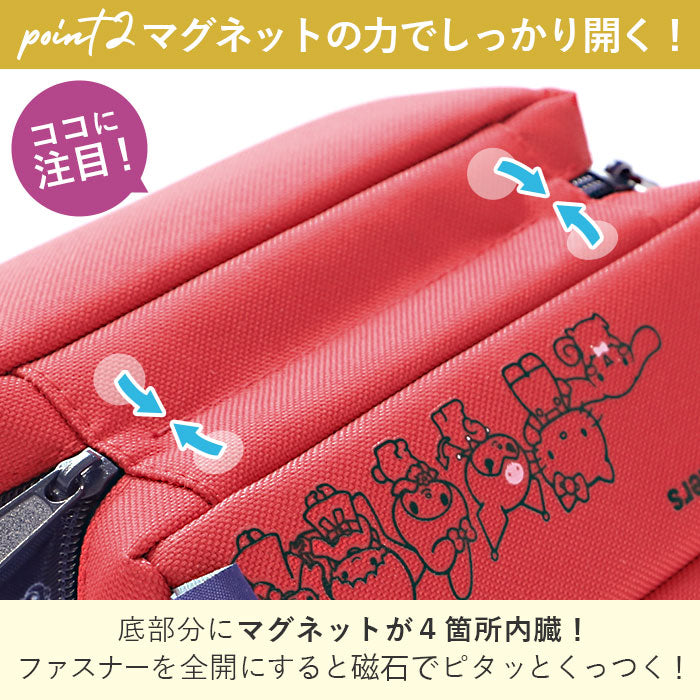 ・ポーチ底部にマグネットが内蔵されているので、ファスナーを全開にすることで底部同士がくっつき、開いたままの状態がキープできるので画期的!