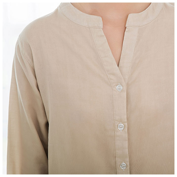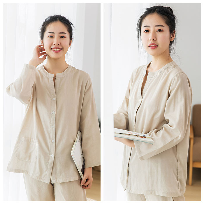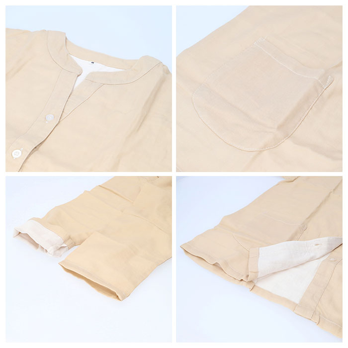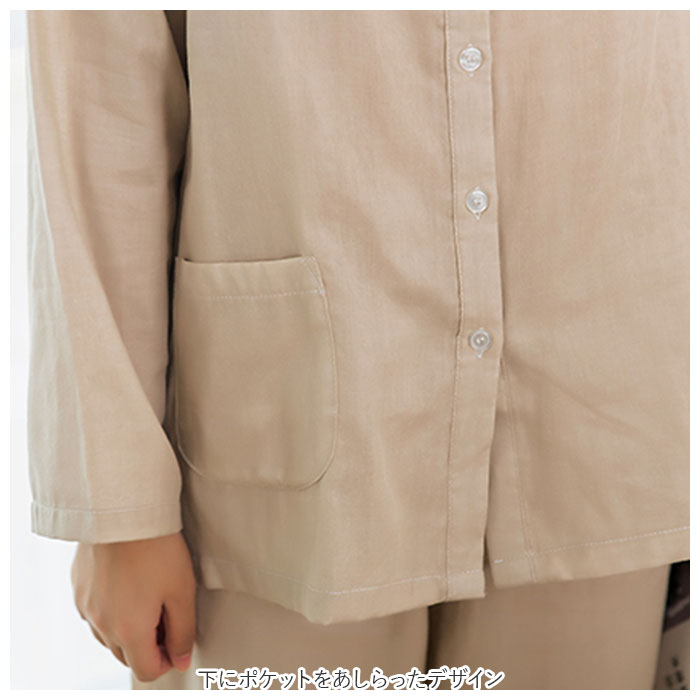 ・トップスは前開きのボタンタイプ。右下にポケットをあしらったデザイン。