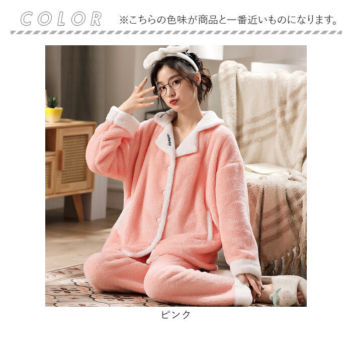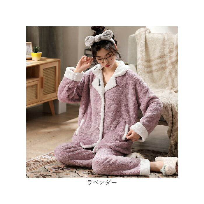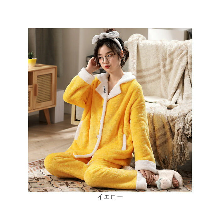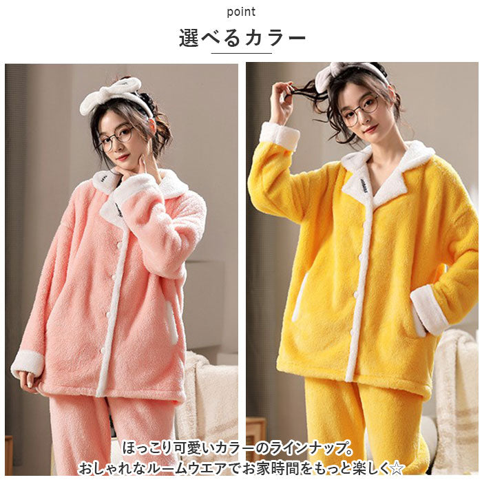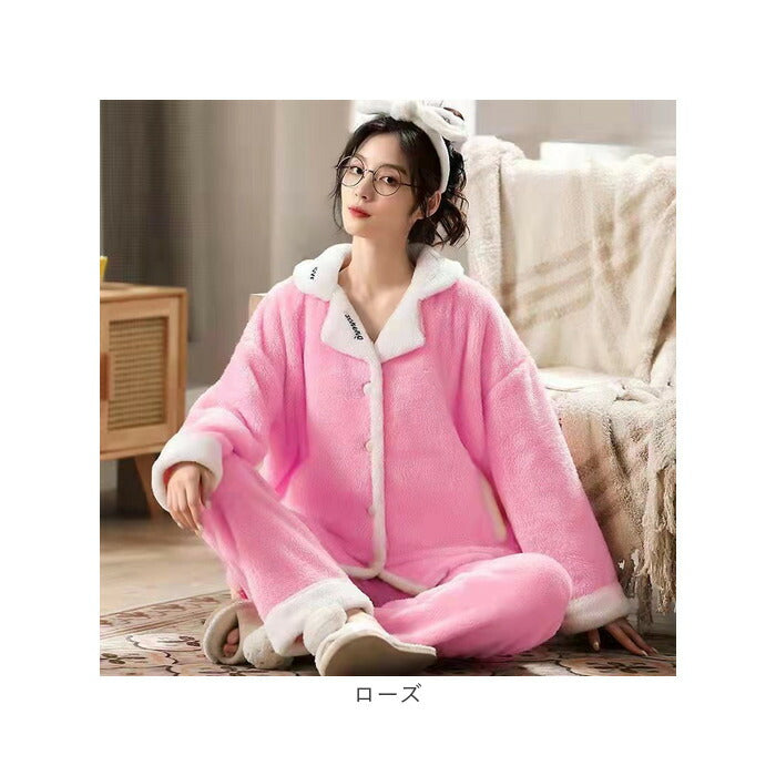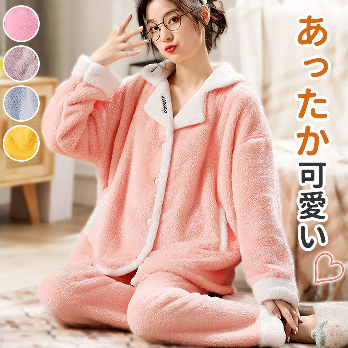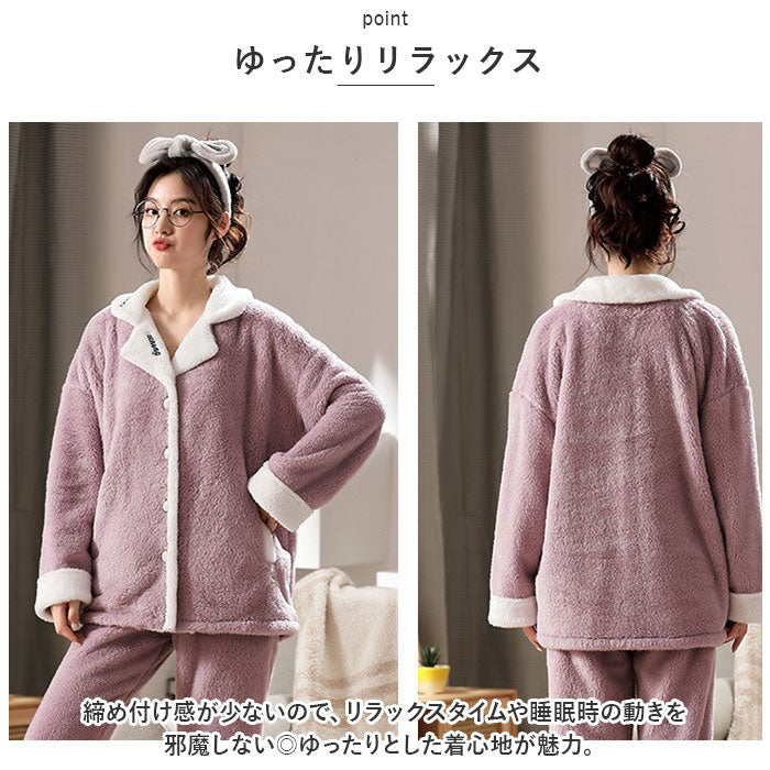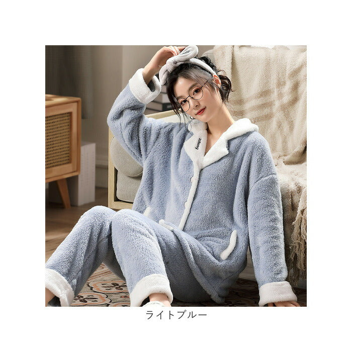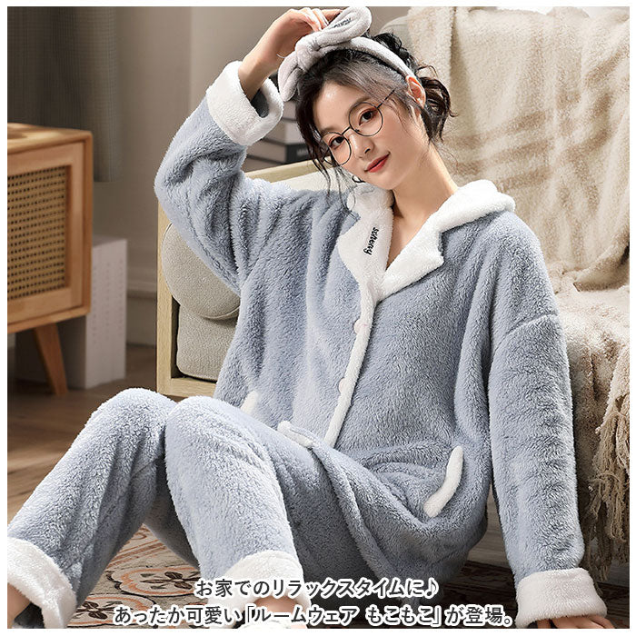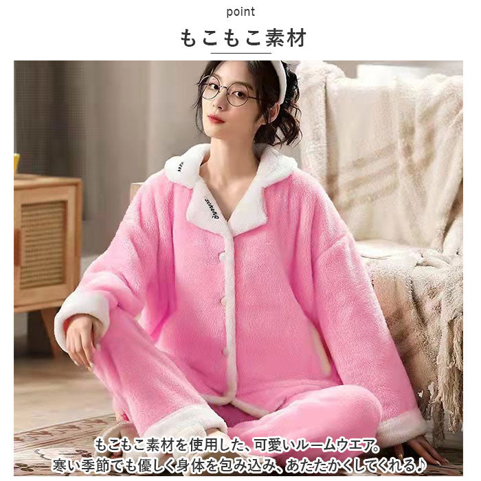 パジャマ レディース ふわふわ 上下セット 通販 ルームウェア 冬 もこもこ フランネル 前開き パンツ 長袖 長ズボン 2点セット セットアップ 厚手 暖かい 部屋着 ナイトウェア
