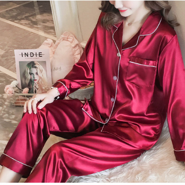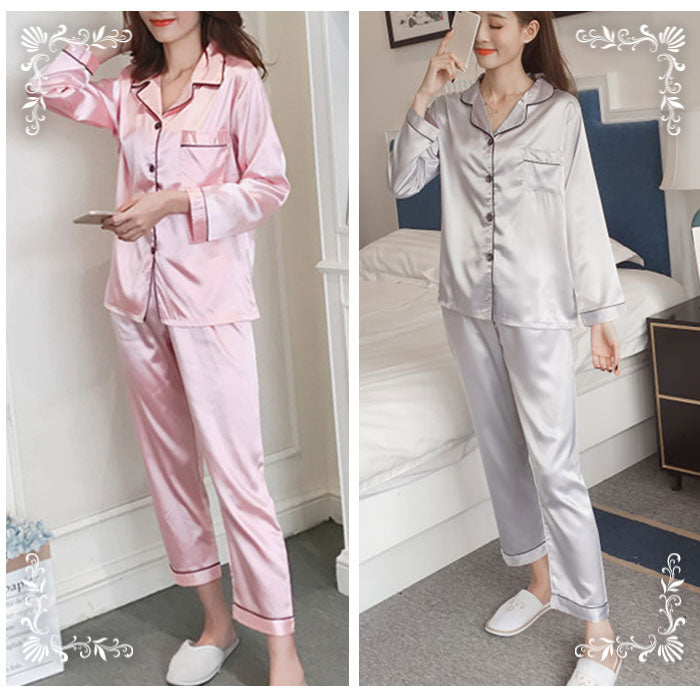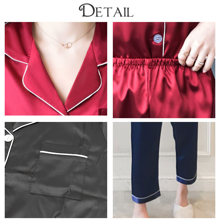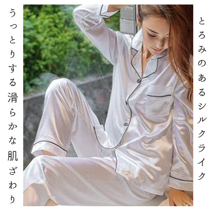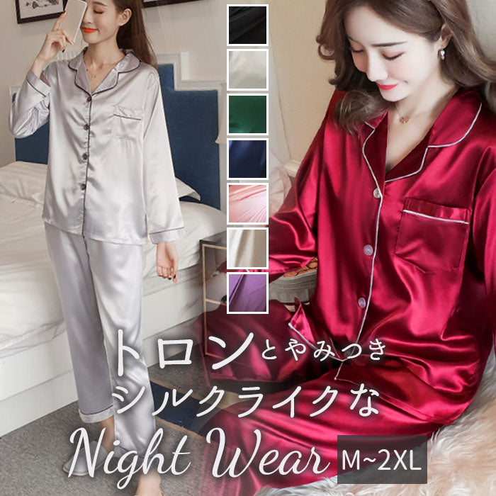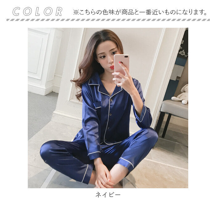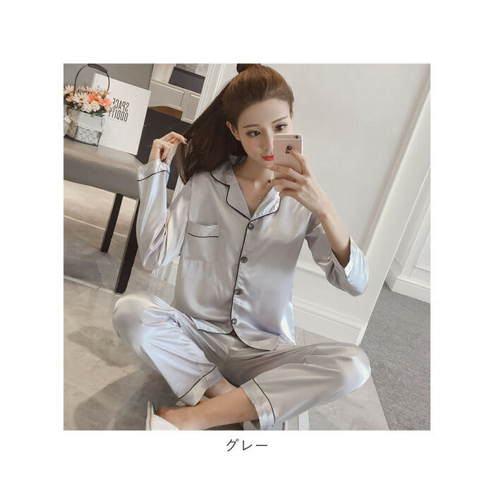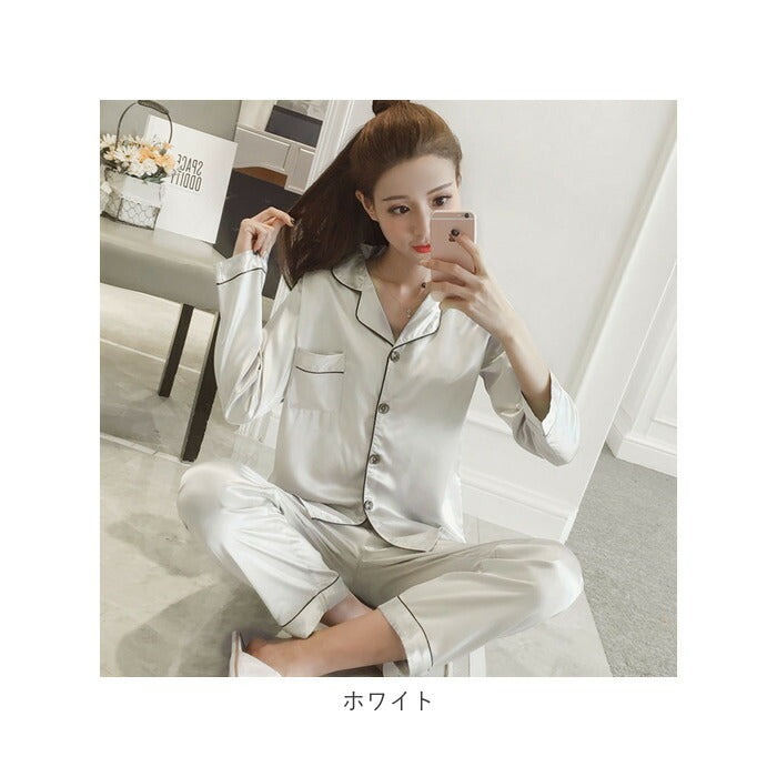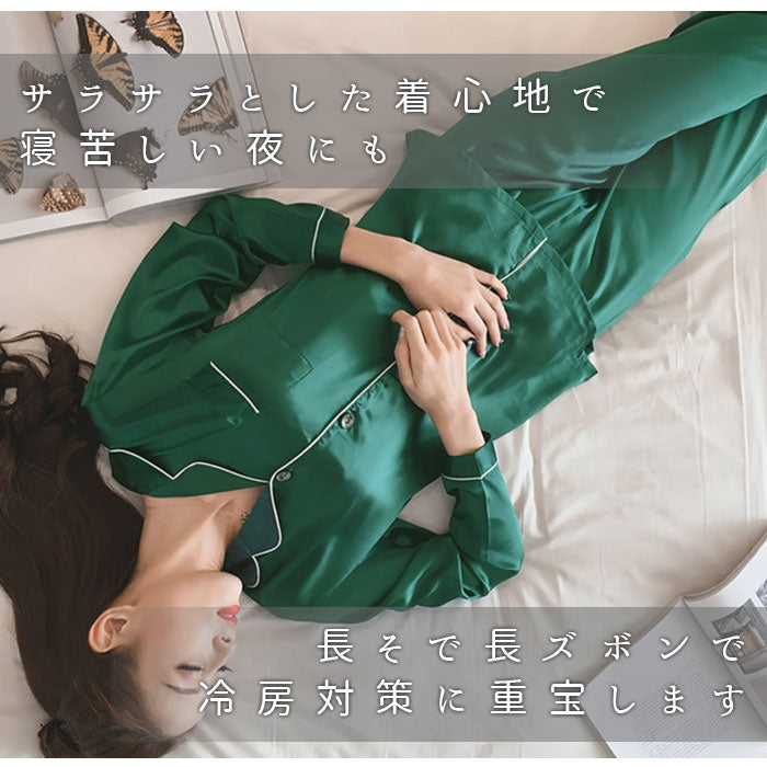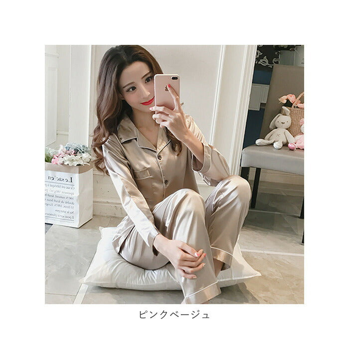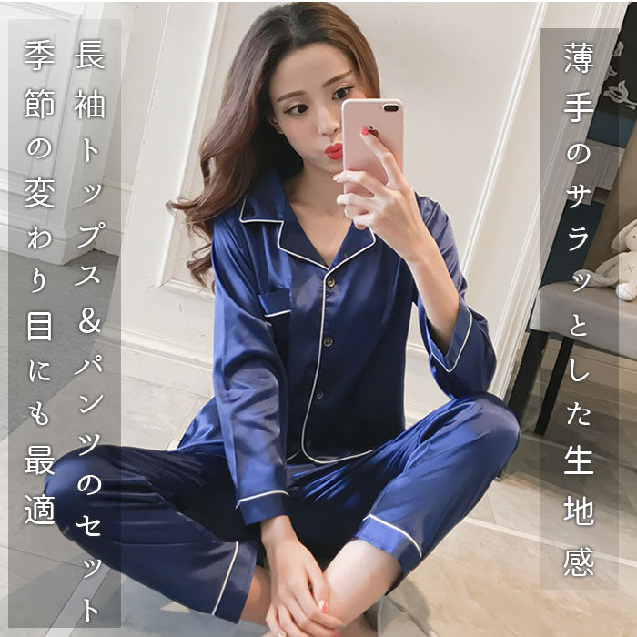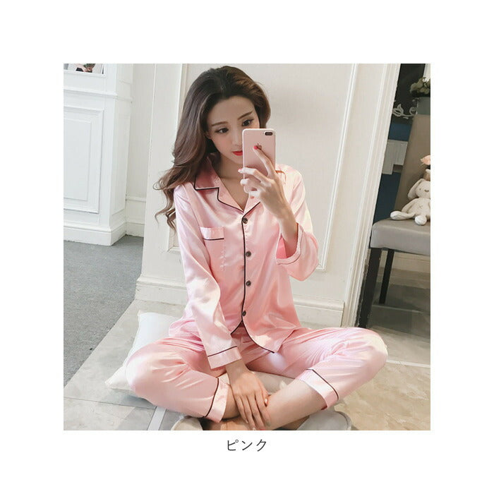 パジャマ レディース 長袖 通販 ルームウェア 部屋着 寝巻き ねまき 寝巻 寝間着 ナイトウエア 室内着 前開き 上下 上下セット セットアップ 冬 長ズボン 大きい 大きいサイズ サテン 旅行 お泊り 入院 可愛い かわいい カワイイ